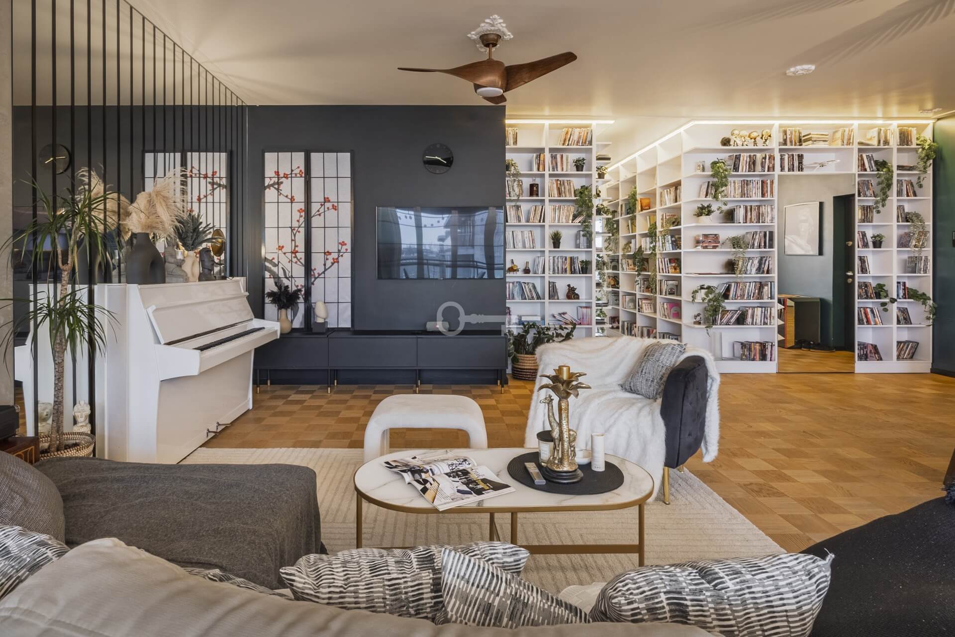 * A spacious living room with a kitchenette,