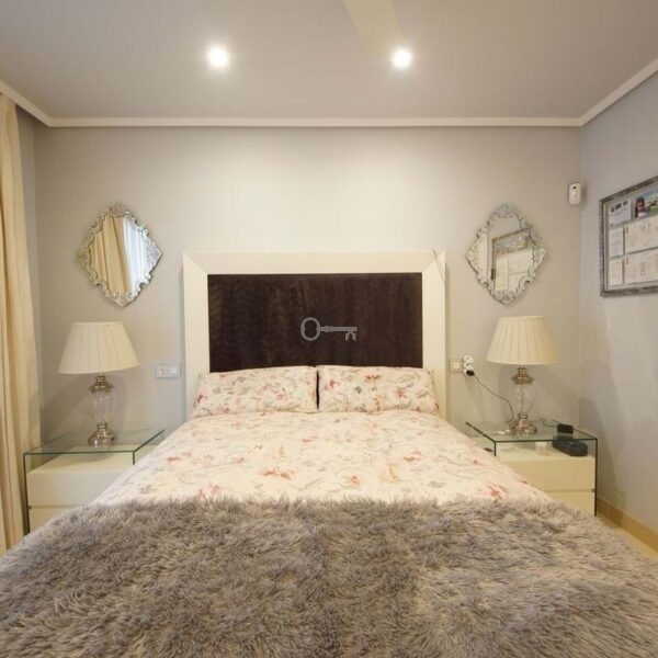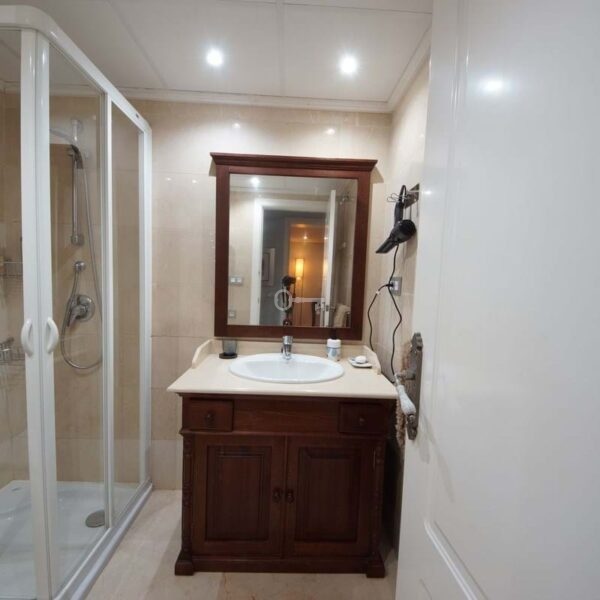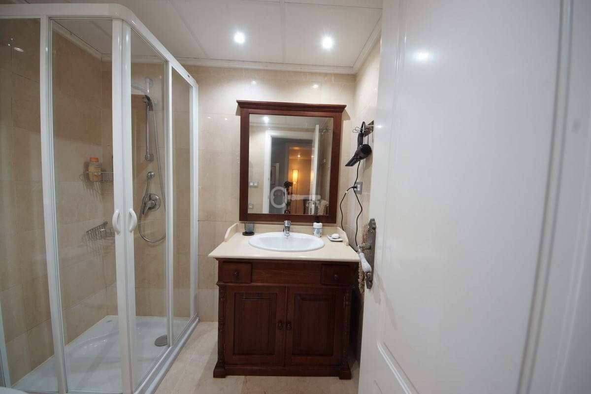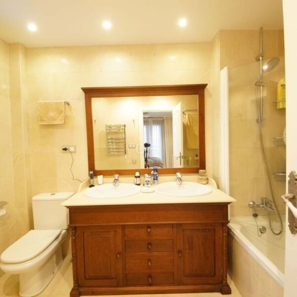 The sleeping area offers two good-sized bedrooms and two bathrooms: one with a shower and the other a full bathroom with double sinks and a bathtub, perfect for everyday use or entertaining guests. The apartment boasts high-quality finishes, light marble floors, and an elegant and contemporary aesthetic. Originally, it had three bedrooms and two bathrooms, but it was renovated, incorporating one of the bedrooms into the living room.