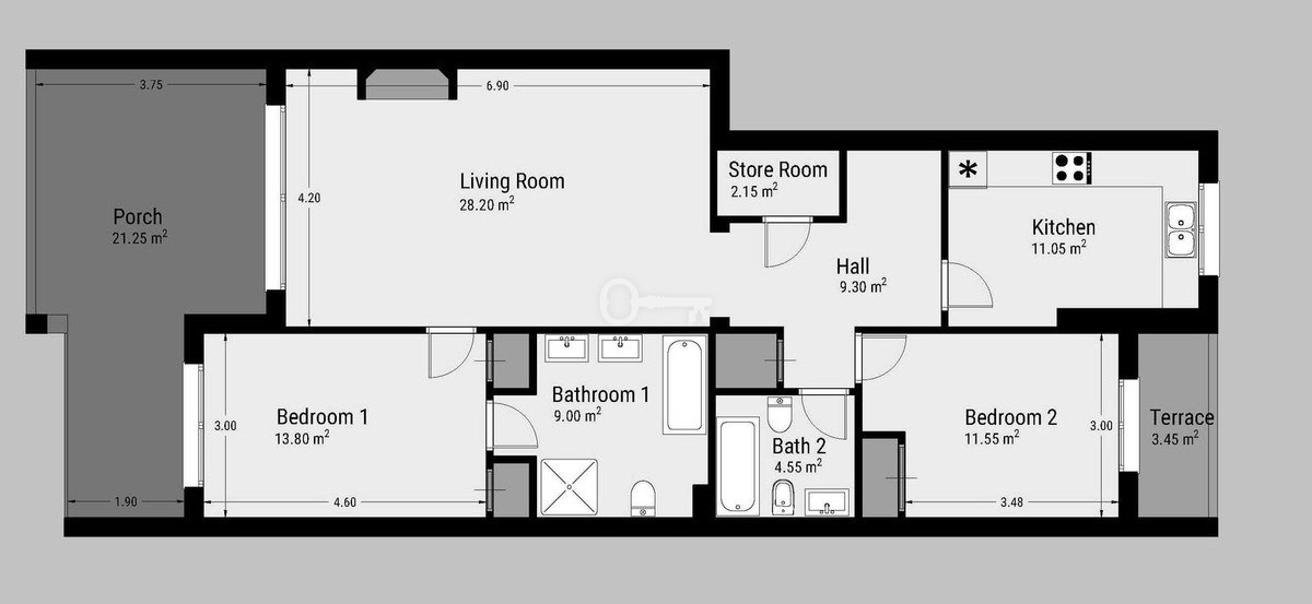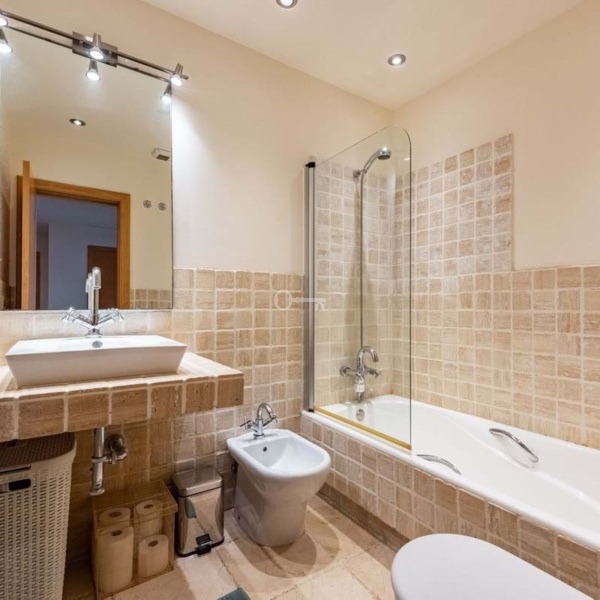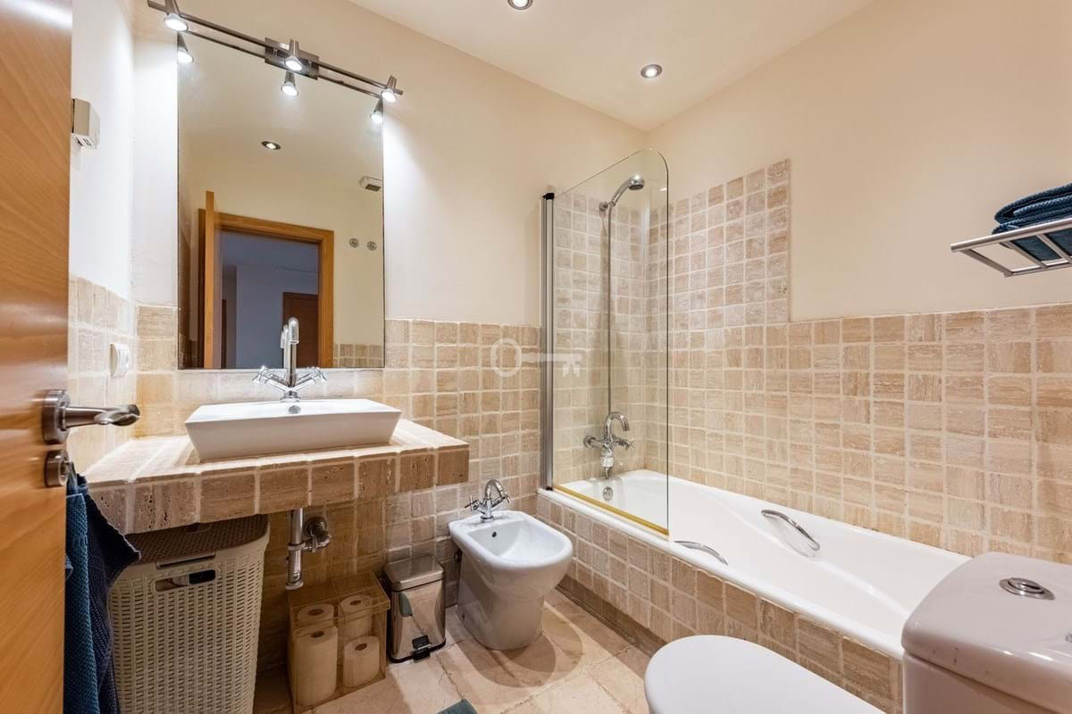 Inside, the apartment offers a bright, spacious living area with a cozy fireplace, two comfortable bedrooms, two bathrooms with underfloor heating, and a well-equipped kitchen with breakfast area. Its elevated position ensures privacy, tranquility, and uninterrupted views, making it a perfect permanent home or holiday retreat.