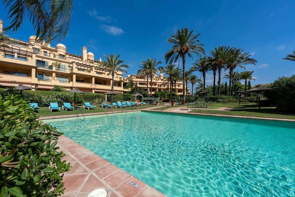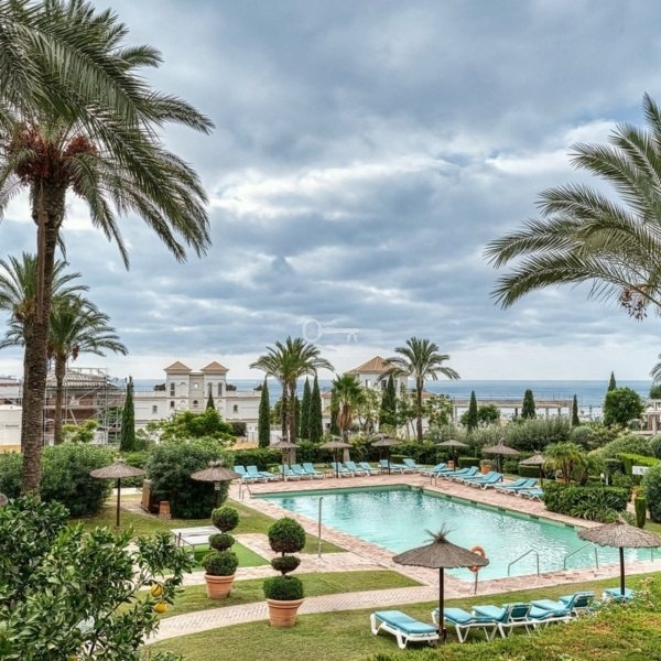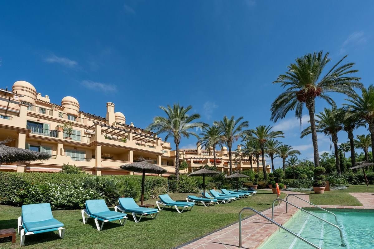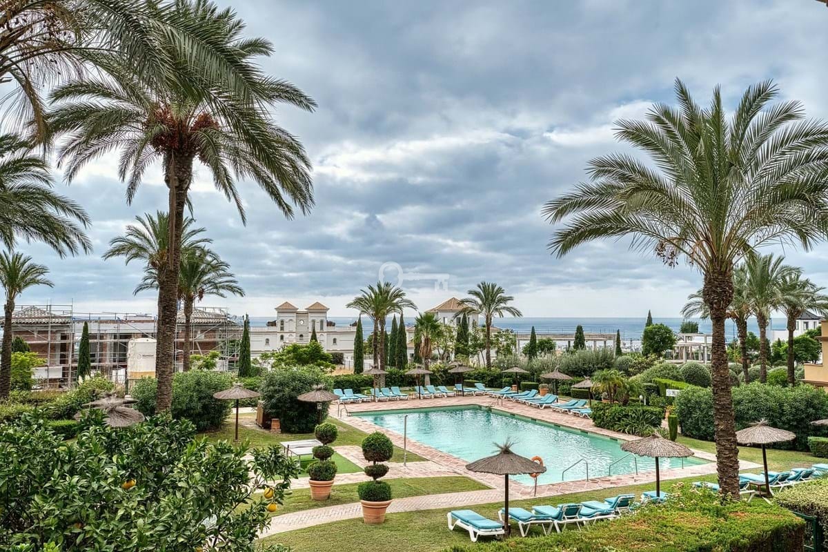 The property boasts a 50 m² private garden with direct access to the main pool, offering beautiful views of the sea and lush communal gardens. The gated community features 24-hour security, three swimming pools, and landscaped green areas, providing a safe and relaxing environment.