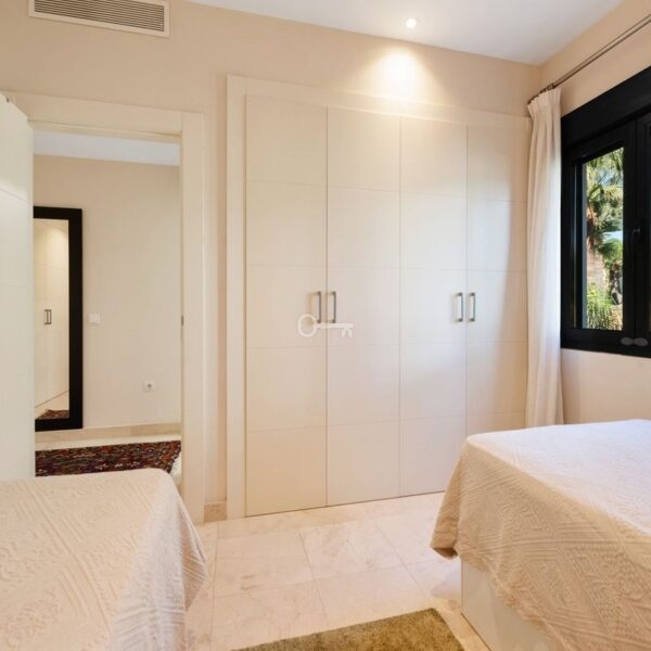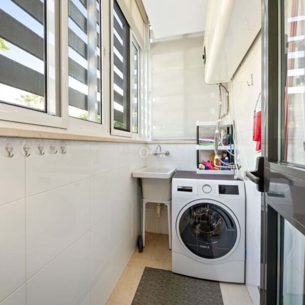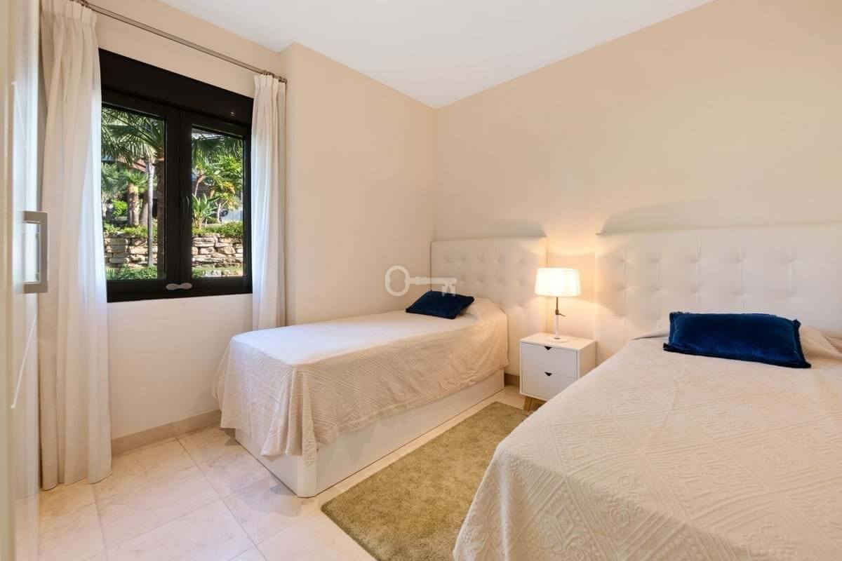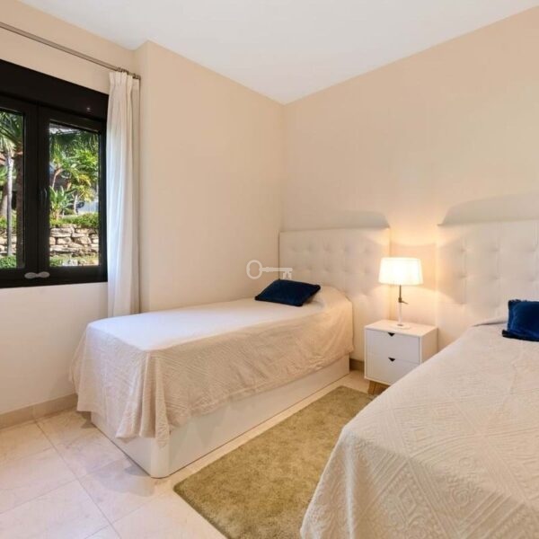 Situated within a secure, beautifully maintained gated community, residents benefit from 24-hour security, lush communal gardens, and well-kept facilities. The apartment also includes one private garage space and storage room, adding extra convenience.