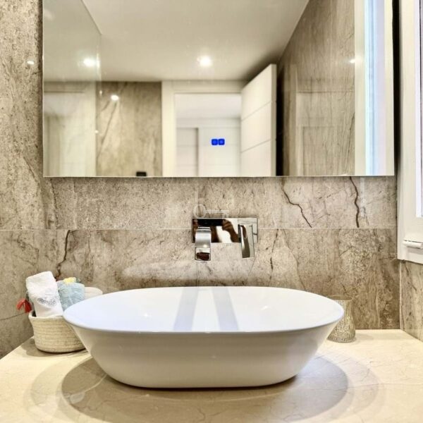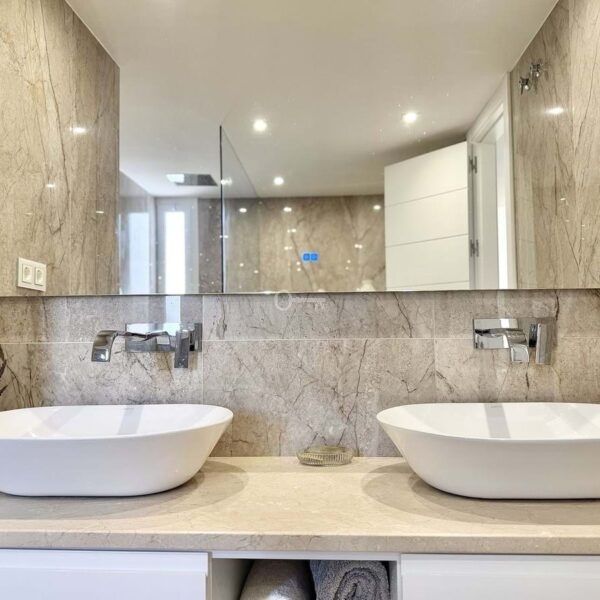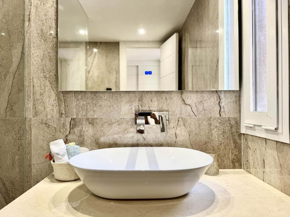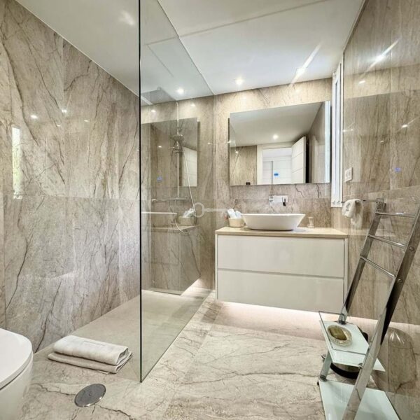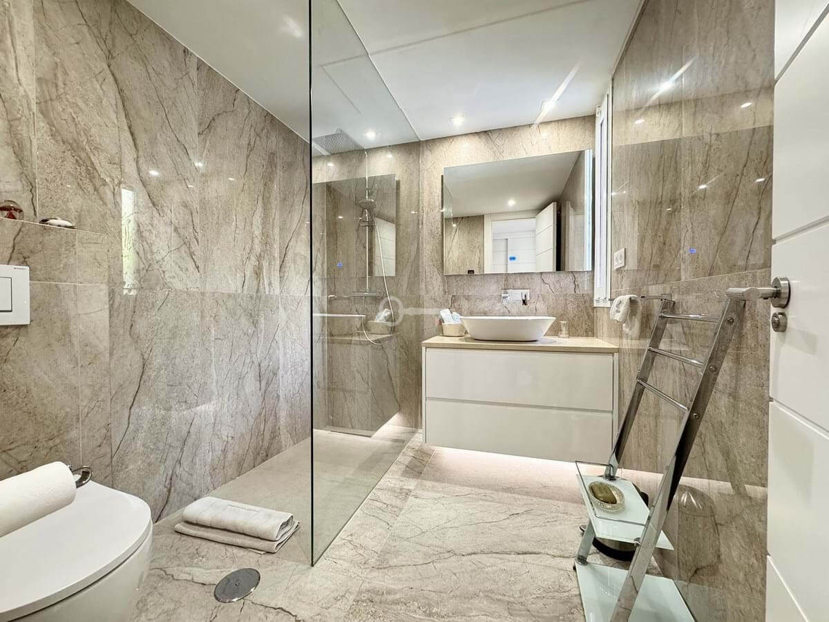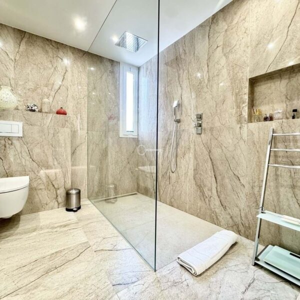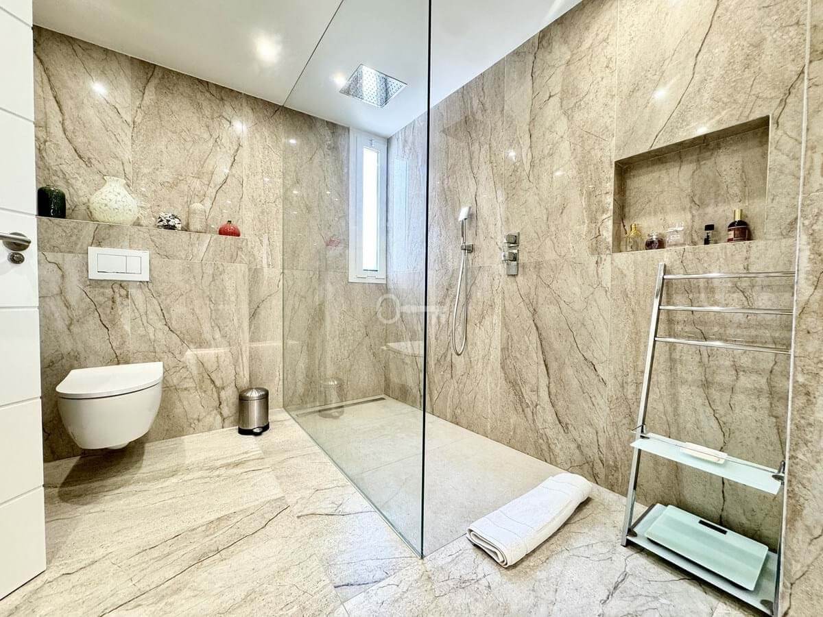 The property features a new open-plan kitchen and refurbished bathrooms with high-quality finishes, offering a modern and sophisticated atmosphere. Large windows with electric shutters and glass curtains on the terrace ensure bright, comfortable spaces all year round.