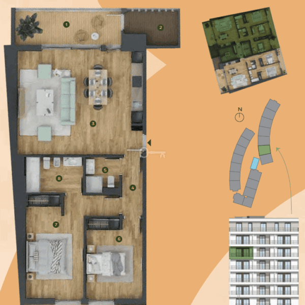 With private underground parking, they meet at a common point – the vast private leisure area. In this outdoor space, with lawns and a swimming pool, relaxation and tranquillity are the great hosts, inviting you to enjoy it with family and friends. In addition, the project offers a decorated lobby, a fully equipped gym and a multipurpose room which you can enjoy in your free time.