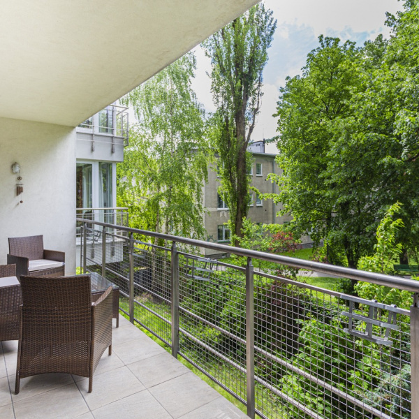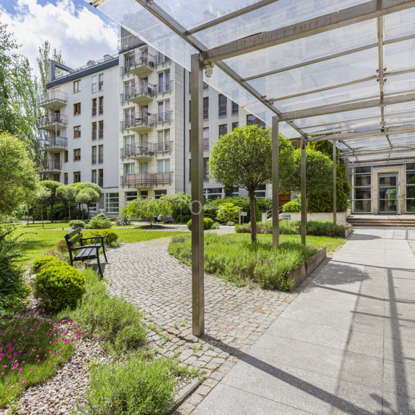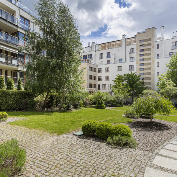 The apartment is located in an intimate, high-standard Rezydencja Łowicka building with a reception desk, 24-hour security and monitoring, in the heart of the green Old Mokotów.