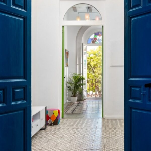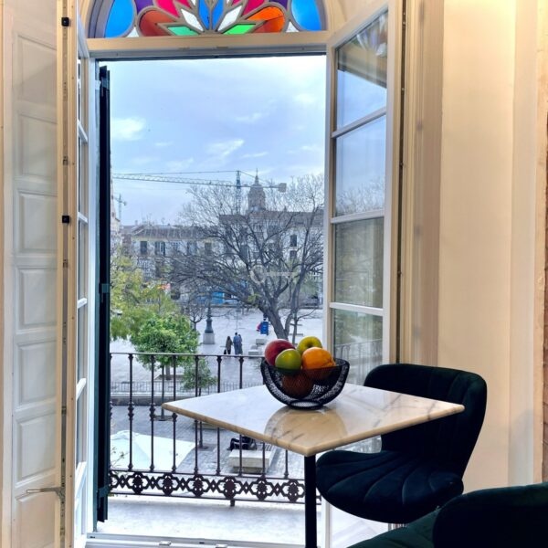 The tall wooden-framed windows feature colourful stained-glass details that project a prismatic play of light over stately rooms and frame expansive views of Plaza de la Merced. The newly installed exterior carpentry, with soundproofing, guarantees a peaceful refuge in an unmatched central location. The property includes five elegant French balconies.