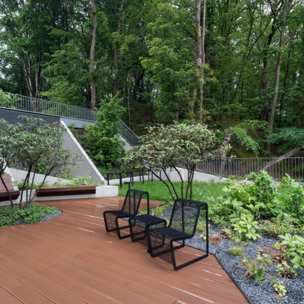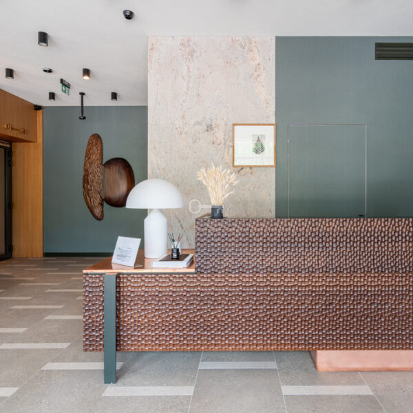 In the buffer zone of the Tri-City Landscape Park was created an apartment building with timeless architecture. The colors of satin copper, graphite, wood, warm spot lighting and craftsmanship accents give the feeling of a high standard apartment building combining with the coziness of home. The building has a green lounge area and a well-equipped fitness center for residents. The rooftop terrace on the 11th floor with a beautiful view of the Tri-City Landscape Park and the sea, is equipped with a barbecue area and the highest children’s playground in the Tri-City.
