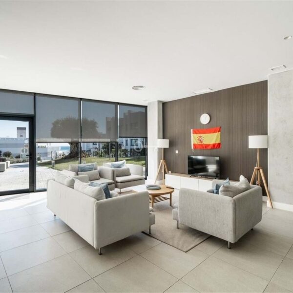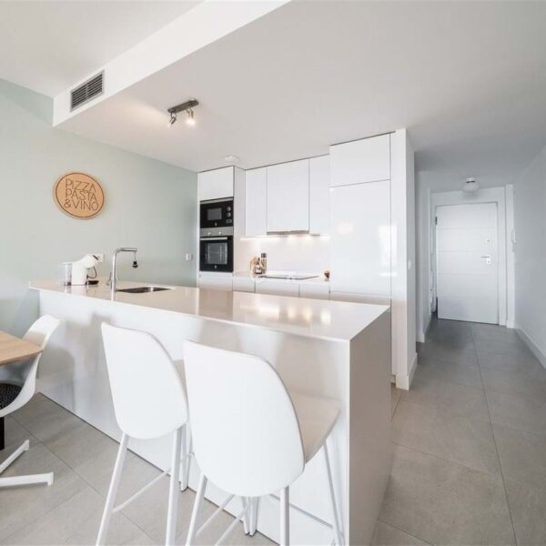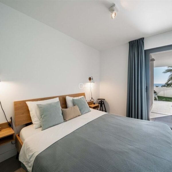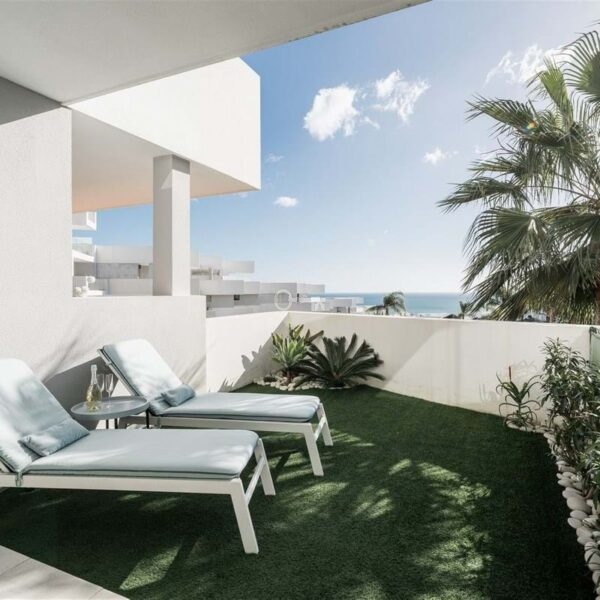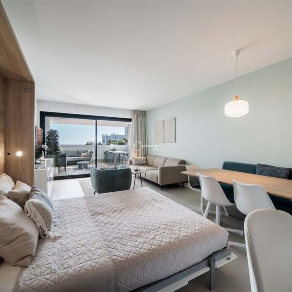 The apartment is filled with natural light and offers a seamless indoor outdoor flow. The open plan living area combines a stylish lounge, dining space, Murphy bed and fully equipped kitchen with integrated appliances, all opening onto a generous covered terrace. From here, you can enjoy the sea views, with both shaded and sunny areas designed for year round enjoyment. The outdoor space is further enhanced by a private garden with artificial grass, planting, and an automatic irrigation system, creating a peaceful setting for relaxing or entertaining.