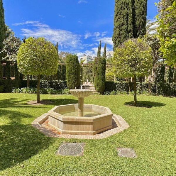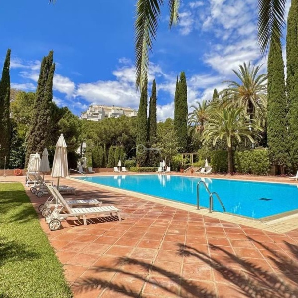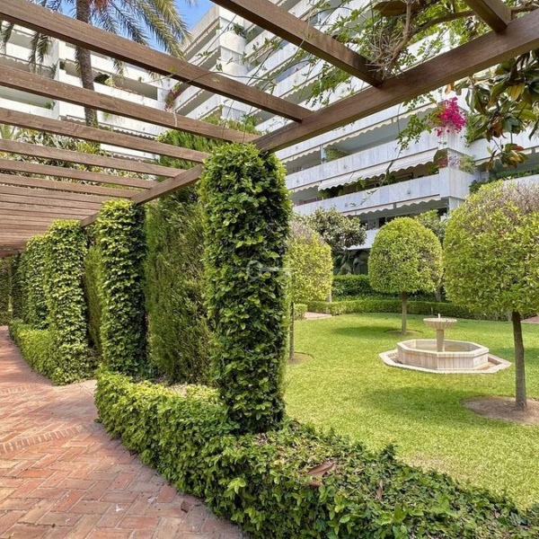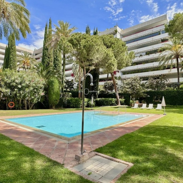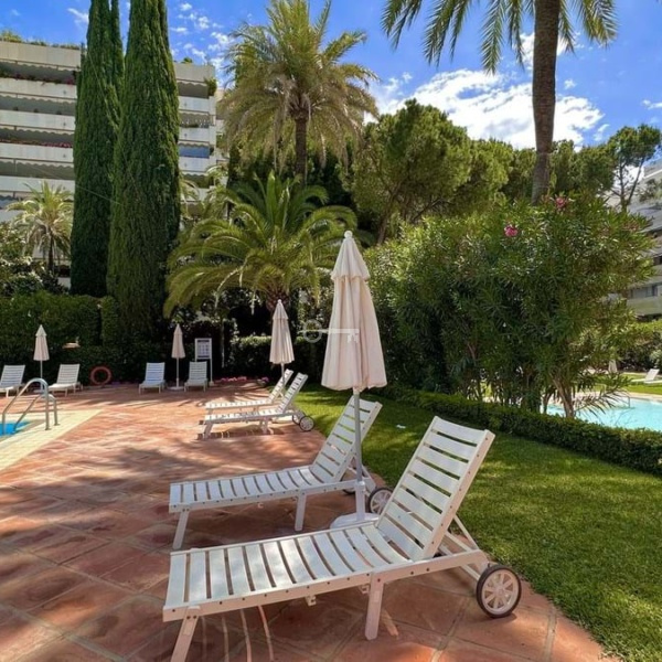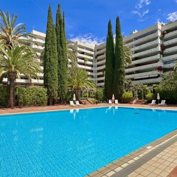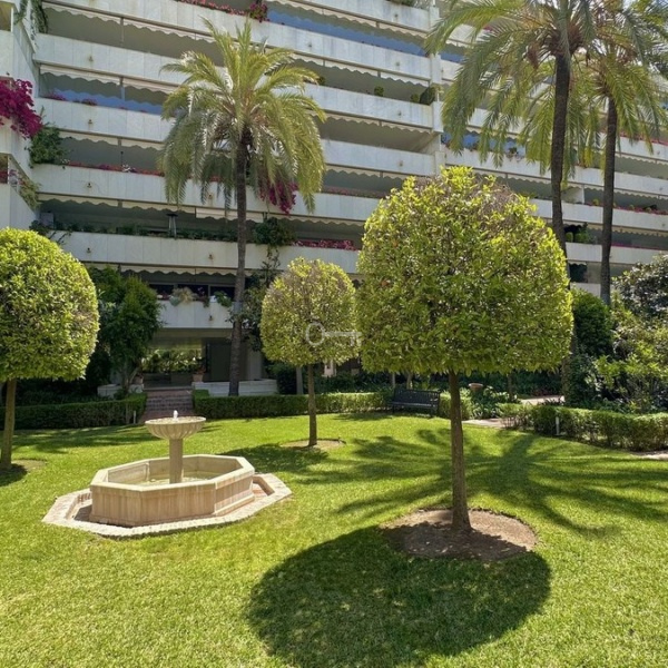 Beautiful and very private apartment in the prestigious complex, located in the center of Marbella, on the second line of the beach and the famous Paseo Maritimo. The complex offers beautiful gardens with two swimming pools, one for children, 24 hour security and concierge service. There is als a new gym with SPA under construction. The apartment offers beautiful views to the garden and pool and has West orientation, it consists of an entrance that leads to the large living room with access to the terrace, the renovated kitchen with the laundry room, the master bedroom en-suite with access to the terrace, two other bedrooms with their bathrooms. The bathrooms are renovated. An ideal property for investment, permanent or vacation residence.