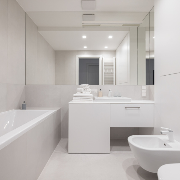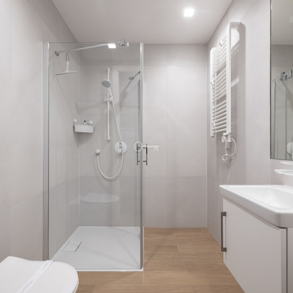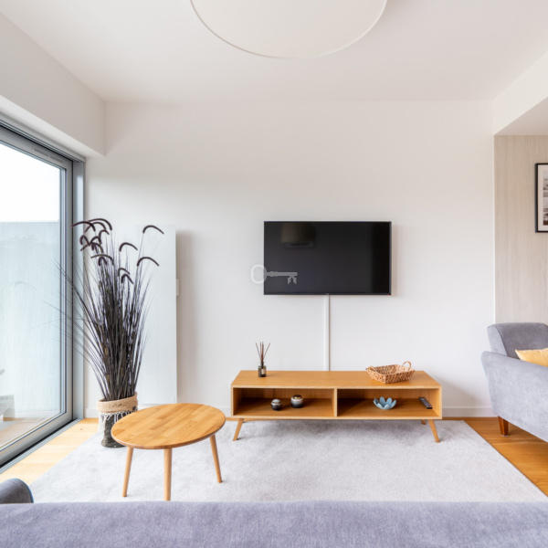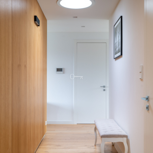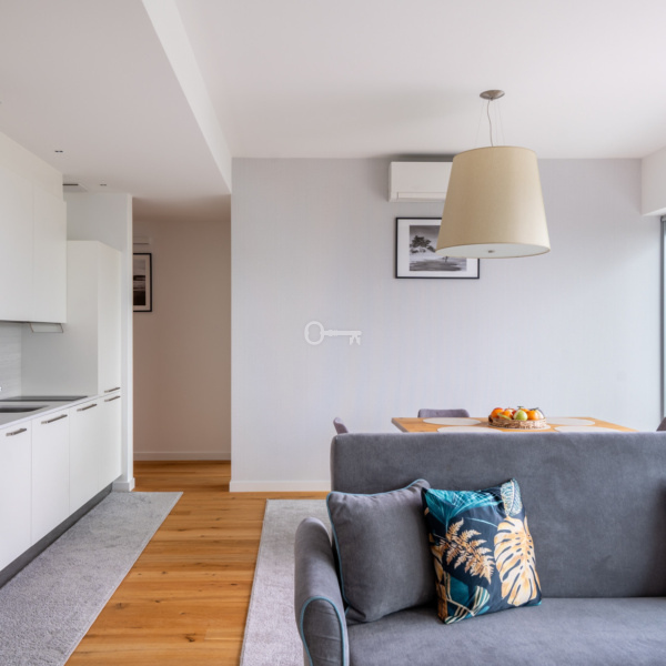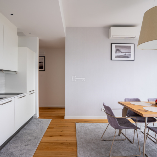The apartment has been finished with high-quality materials: wood floors, kitchenette equipped with necessary appliances (dishwasher, electr. kettle, refrigerator, coffee maker, induction hob), stone countertops, air conditioning system. It was designed to meet the most demanding residents.