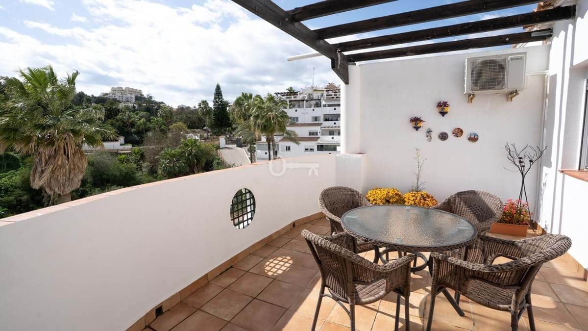 Residents benefit from a host of communal amenities, including a beautifully maintained garden, a refreshing swimming pool, and secure garage facilities. The gated community offers peace of mind, while the covered terrace provides a perfect spot for alfresco dining or simply soaking in the panoramic views. The apartment is presented in excellent condition, ready to move in and enjoy immediately.
