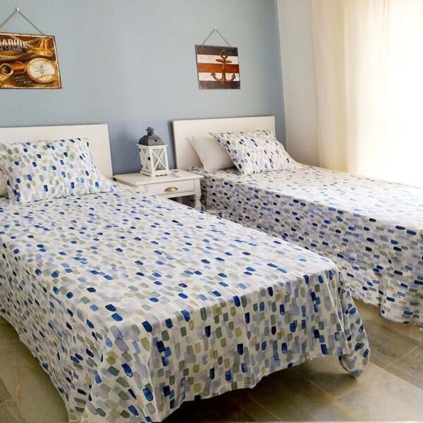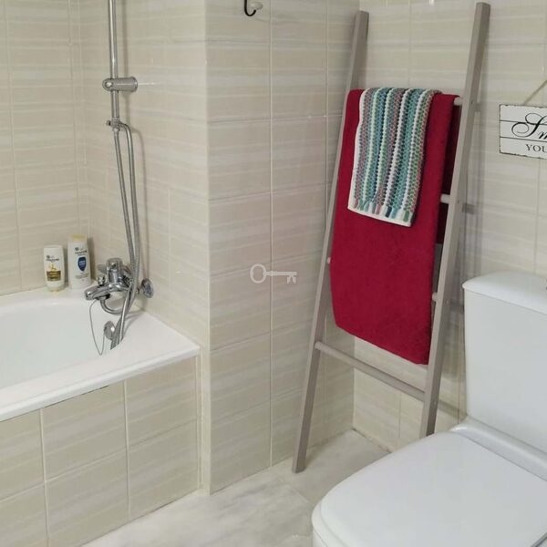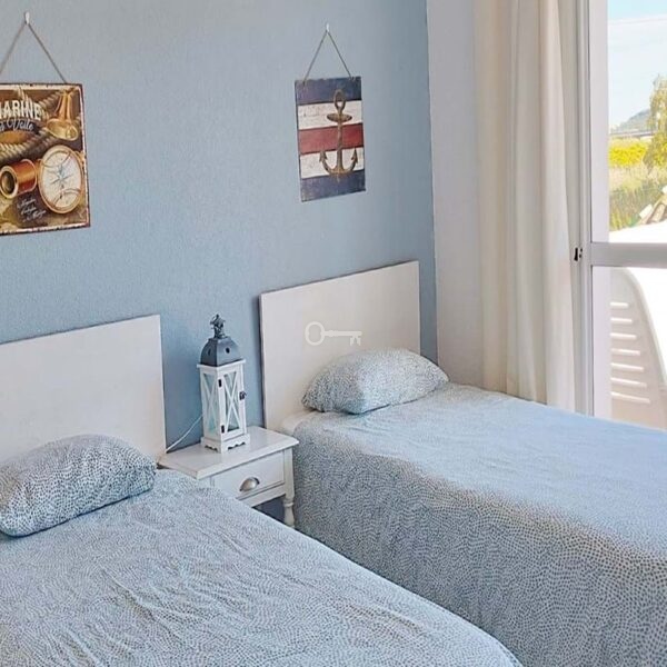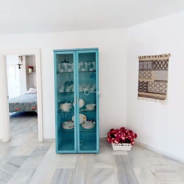 The property features two well-sized bedrooms, a full bathroom, and an additional guest toilet. The fully fitted kitchen includes a separate utility area, designed for everyday practicality without compromising on space. Marble floors, double glazing, and air conditioning add to the sense of comfort throughout.