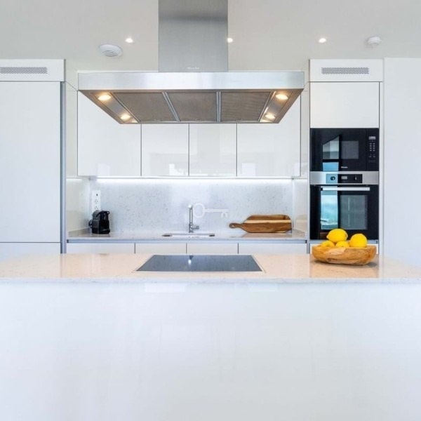 The apartment features two bedrooms with en-suite bathrooms, a guest toilet, and a modern open-plan kitchen fitted with top-quality Miele appliances, including oven, microwave, and dishwasher.