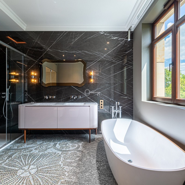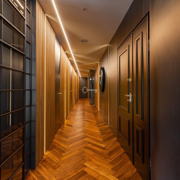 The apartment has aesthetic and discreet air conditioning without hanging devices on the walls (dedicated exclusively to this apartment), underfloor heating in the bathrooms, central vacuum cleaner, KNX smart home system that manages air conditioning, lighting, electric curtains, as well as electronics and a sound system that allows you to listen individual music in each room.