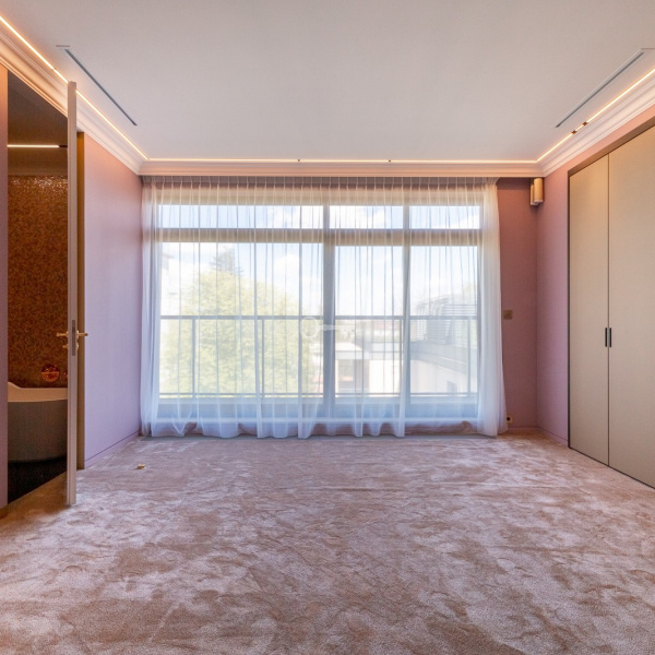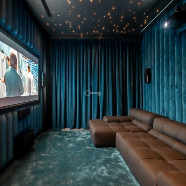 The art for which space was found on the walls in the corridor leading to the private part and in the living room, where a dedicated space for paintings or sculptures from own collection was created. The cinema room is an ideal place for children and adults. The 100-inch large screen, 4K projector and surround sound system allow you to watch movies and games on the console. The built-in wardrobe has a place for a small fridge for drinks and popcorn machine. Ceiling covered with diodes imitating the constellations of stars.