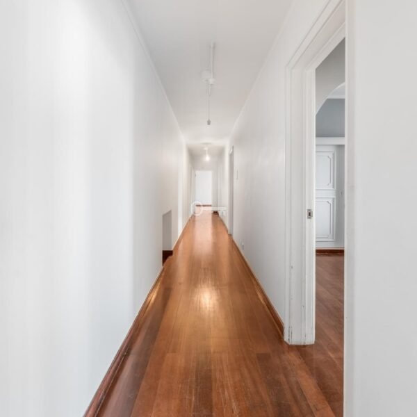 The private area includes a hallway leading to two bedrooms, a bathroom with a walk-in shower, and a large suite.