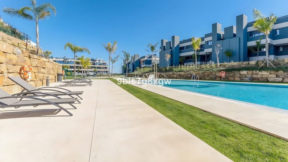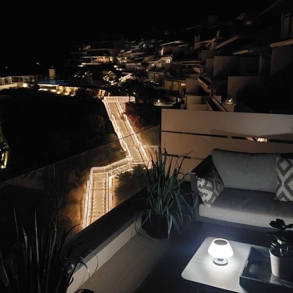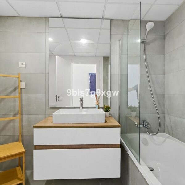 The apartment stands out for its brightness and fluid layout. Large floor-to-ceiling windows create a seamless connection between indoor and outdoor spaces. The fully equipped kitchen (with separate laundry room) opens onto a spacious living-dining area, leading to a large 31m² private South-West facing terrace, partially covered: the ideal spot for al fresco dining, a quiet reading moment, or simply enjoying the panoramic views of the sea, Gibraltar and Selwo Zoo. As night falls, after watching the sunset, the view becomes truly magical.