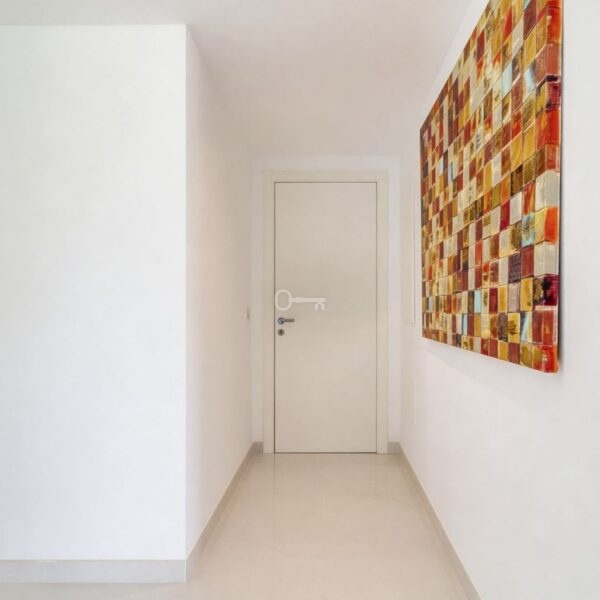 * Stylish minimalist architectural appearance with white ceramic tiles, white fitted wardrobes, white kitchen island and bathrooms