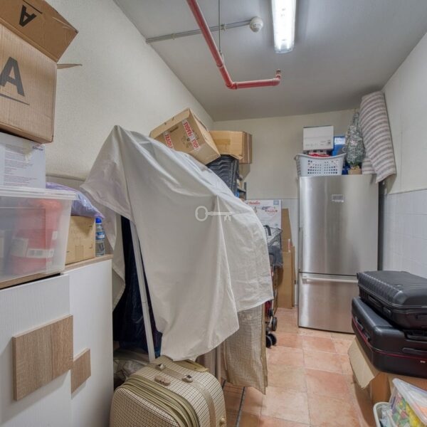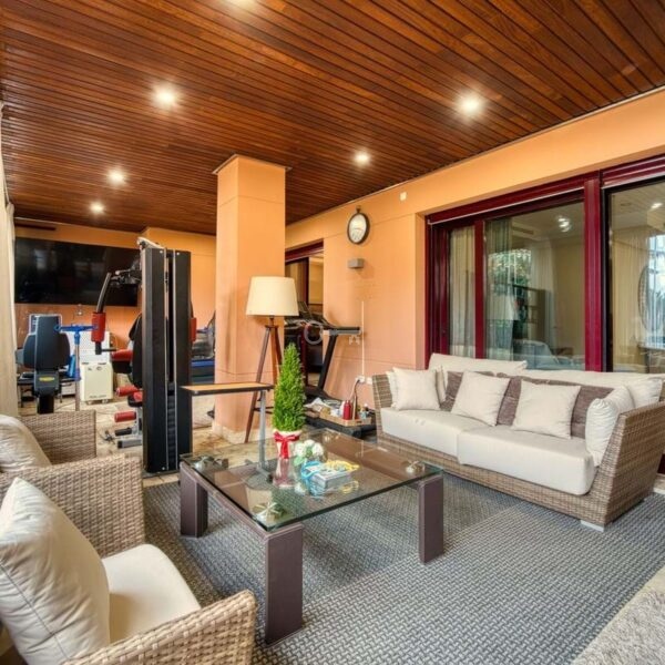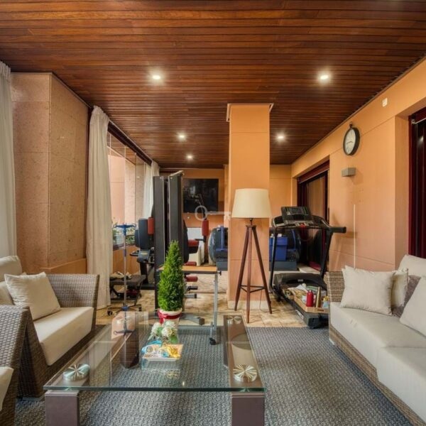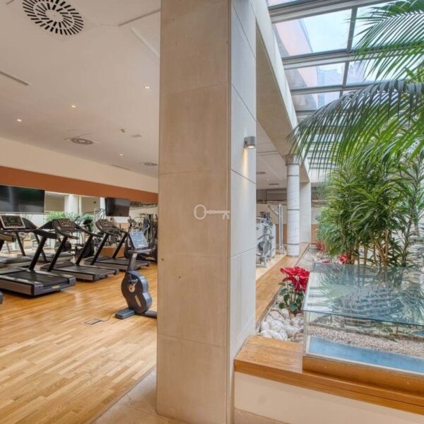 The fully fitted kitchen comes equipped with quality appliances, complemented by a separate laundry room. Additional features include air conditioning, central heating, electric blinds, double glazing, and a high level of security within the gated community, which offers 24-hour surveillance and concierge service.