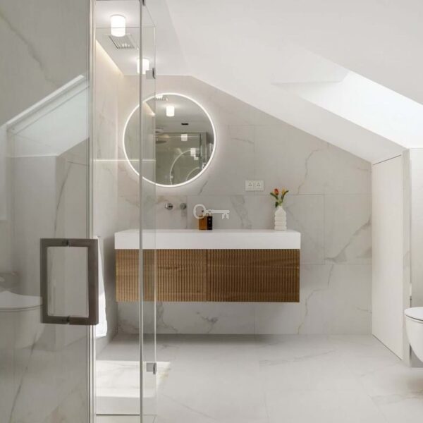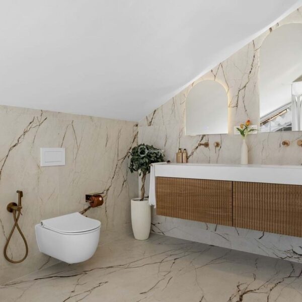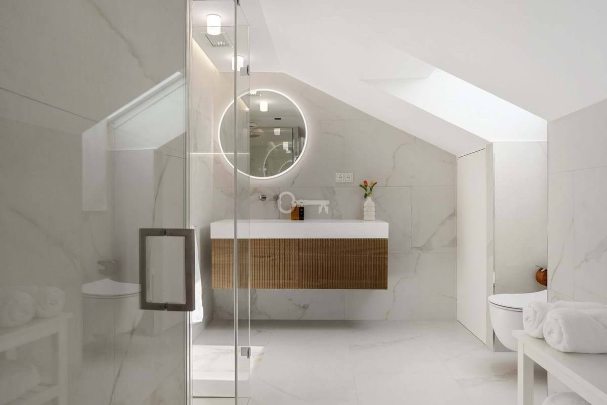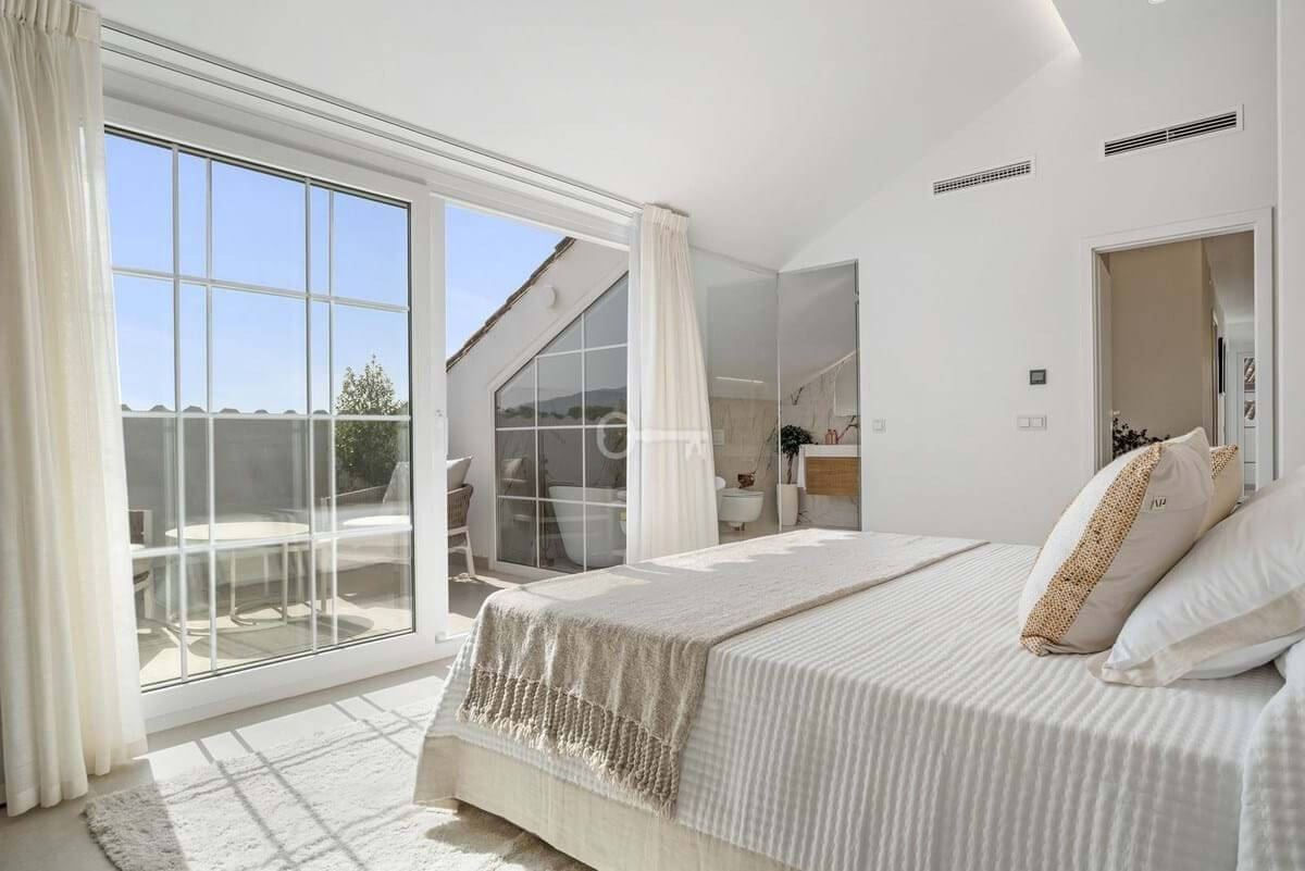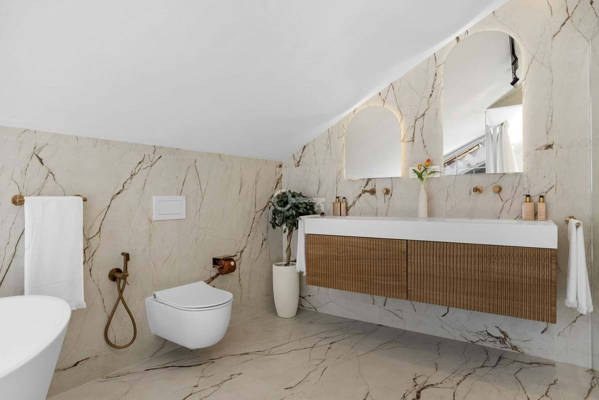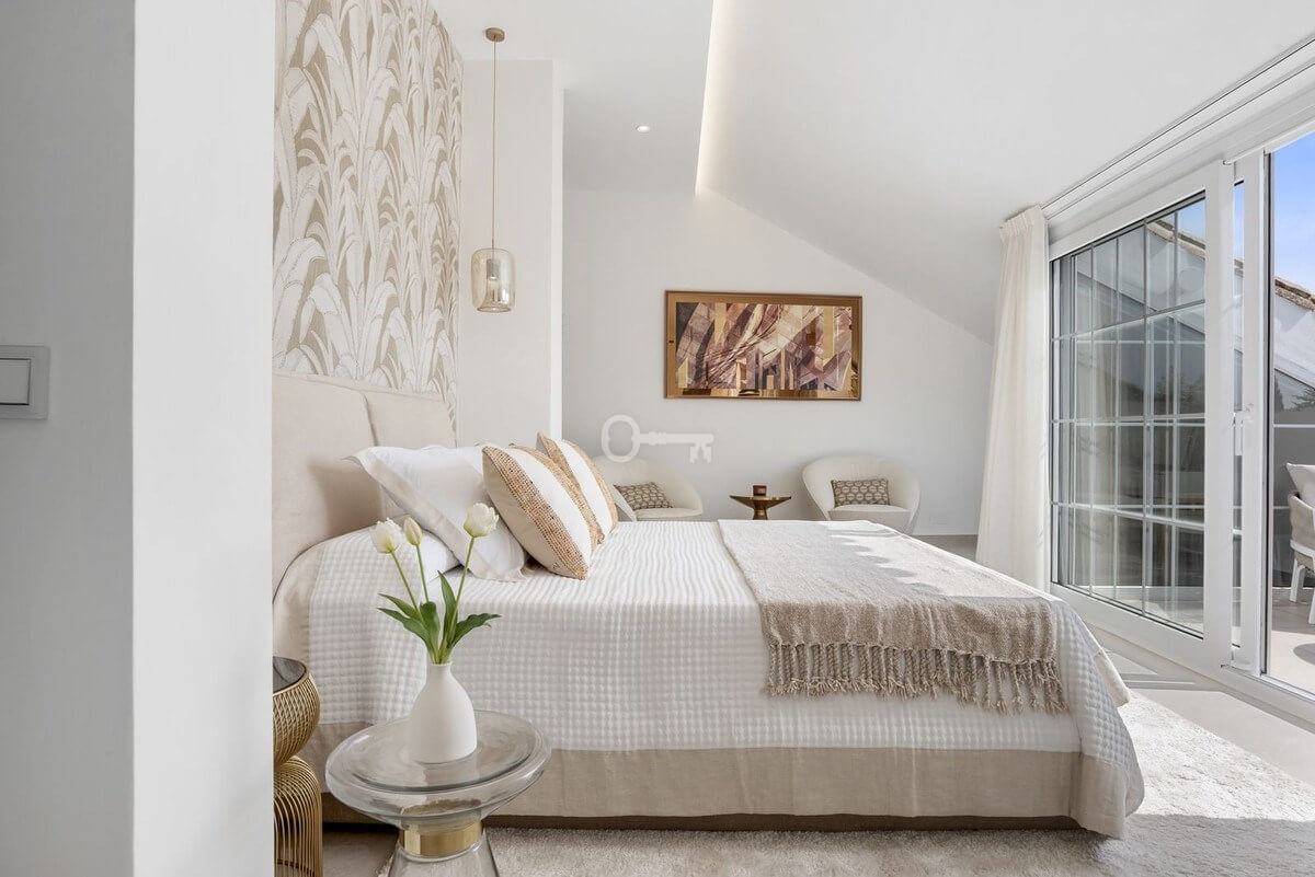 The penthouse includes five beautifully designed bedrooms, including a spectacular master suite on the upper level. With slanted ceilings, a generous walk-in closet, a spa-inspired bathroom, and a private terrace overlooking the sea and La Concha mountain, this is an oasis of complete relaxation. Two additional bedrooms feature en-suite bathrooms, while two share a modern family bathroom. A flexible fifth room serves perfectly as a guest bedroom or office. A separate laundry room with terrace access shows that even the practical details have been given the same attention.