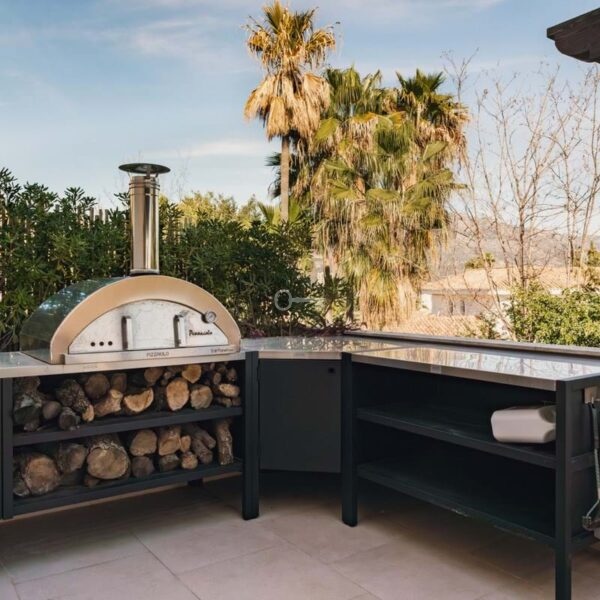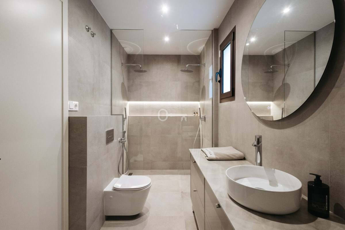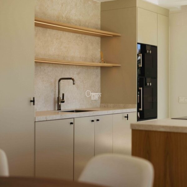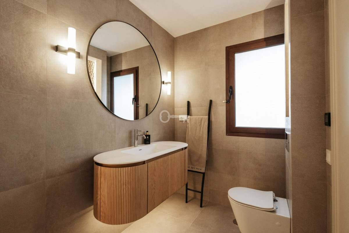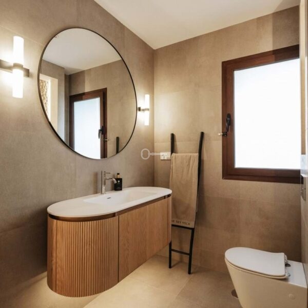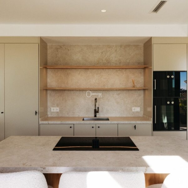 From here, you step directly onto a generous terrace offering spectacular sea and mountain views, complete with a Scandinavian outdoor kitchen, pizza oven, and BBQ, ideal for entertaining and sunset dining.