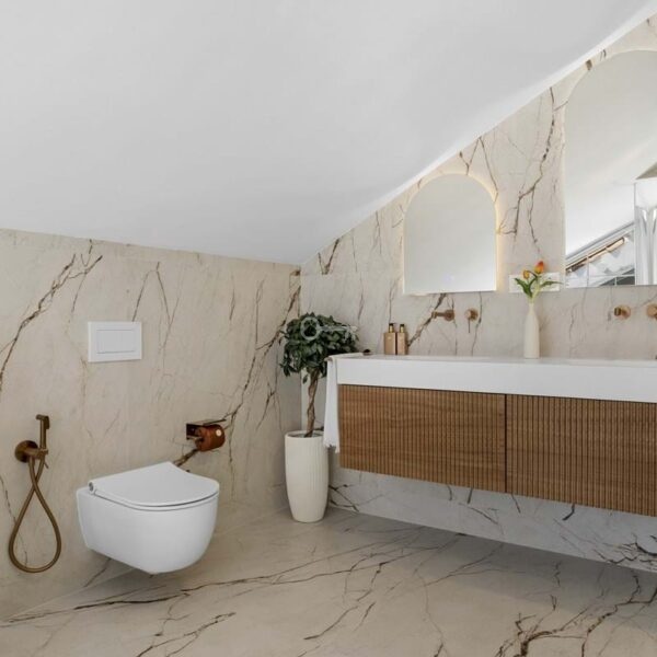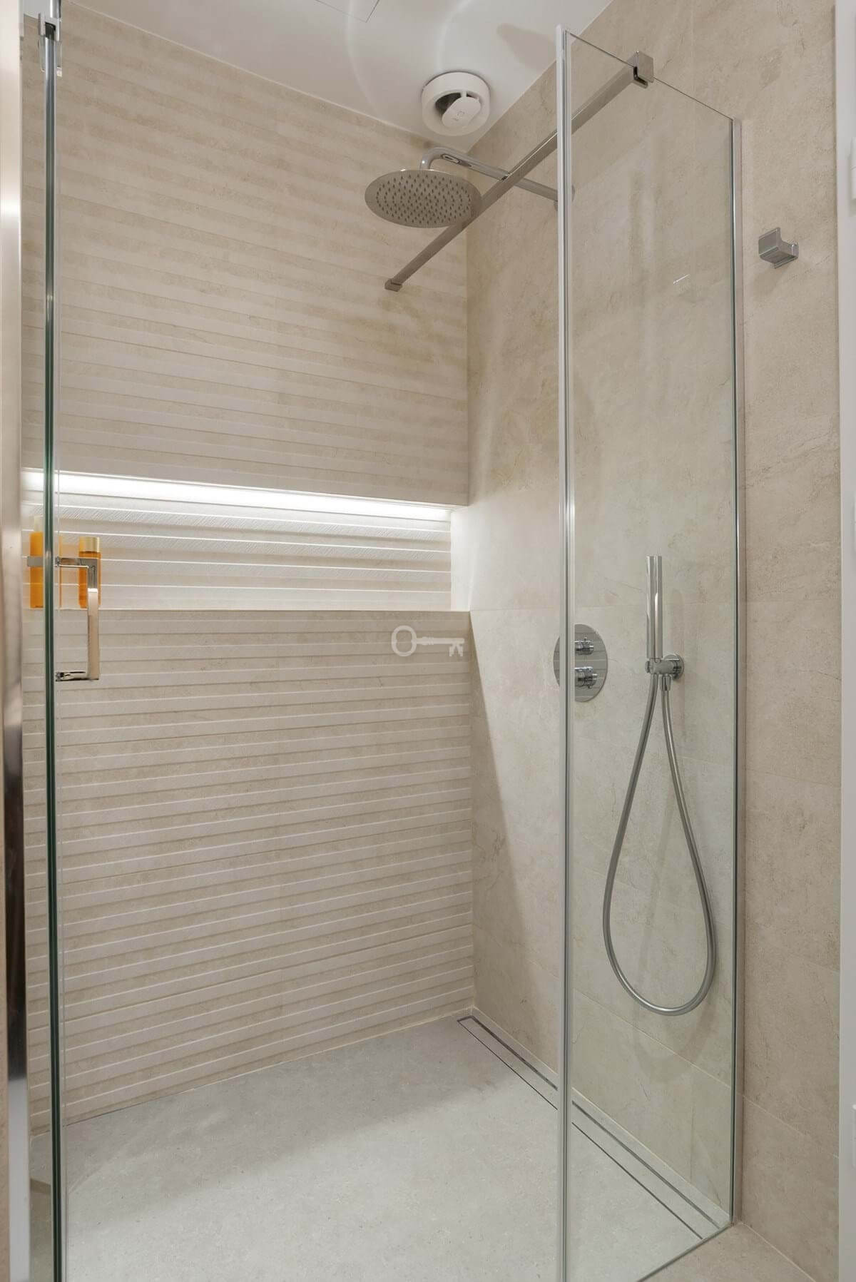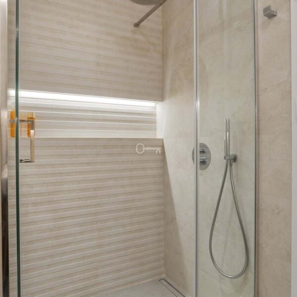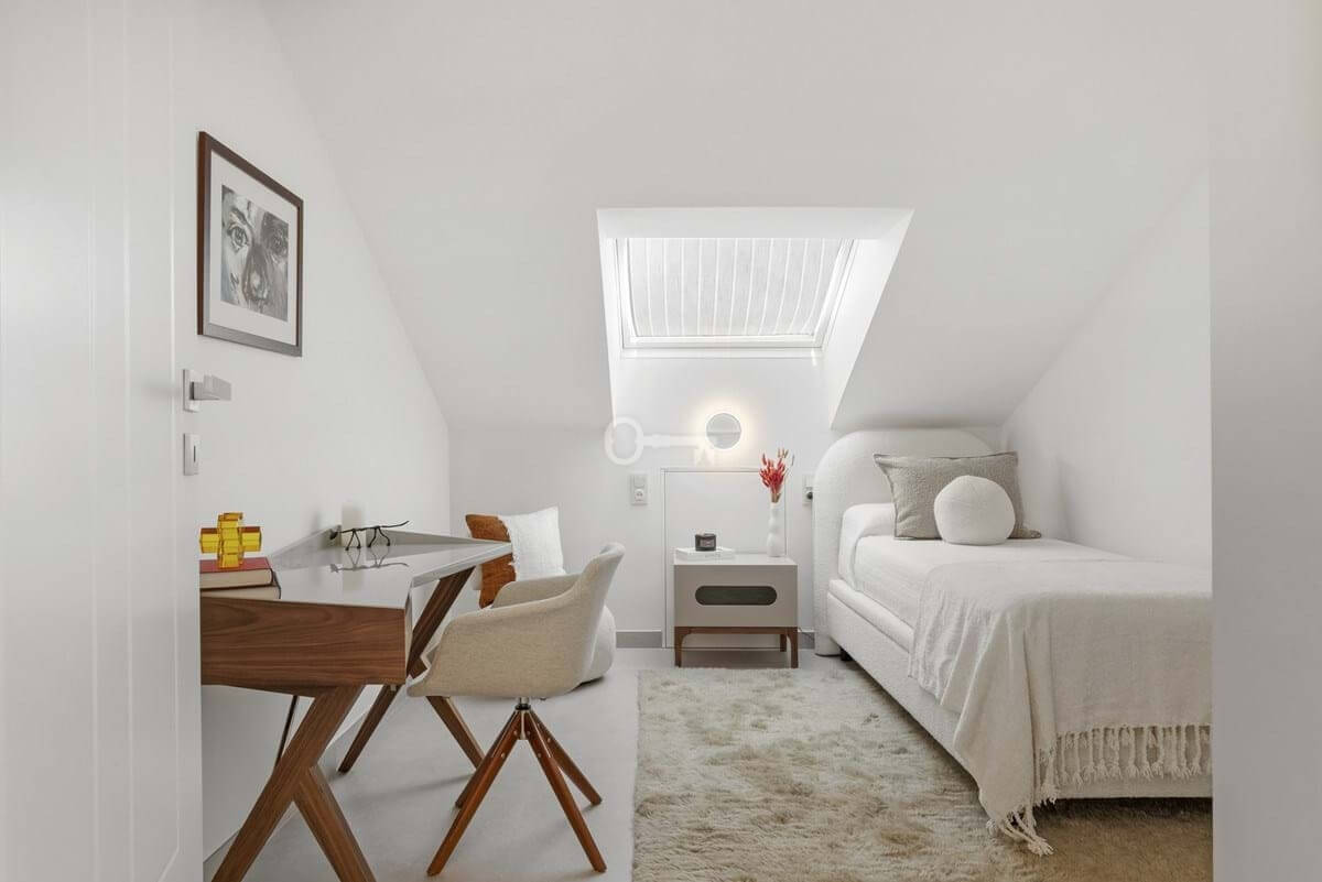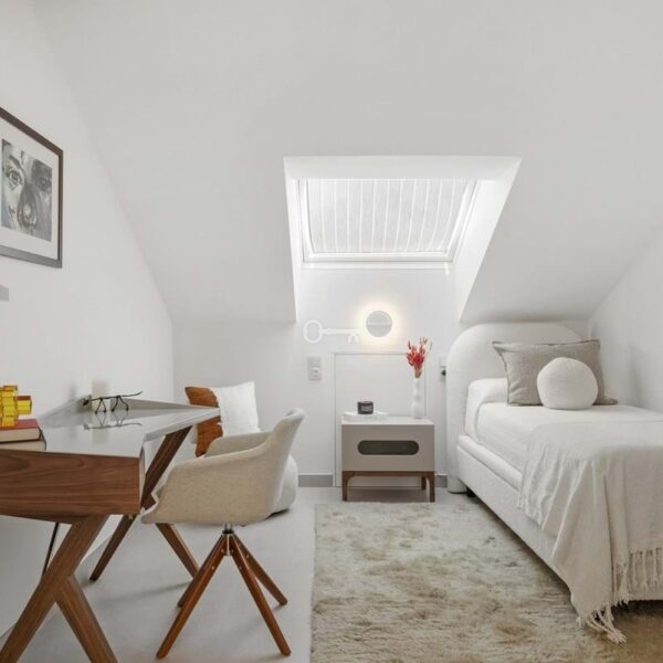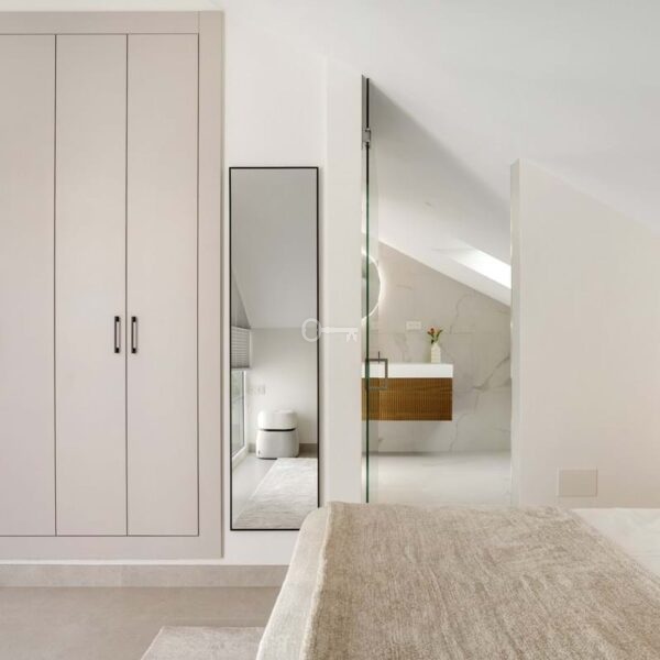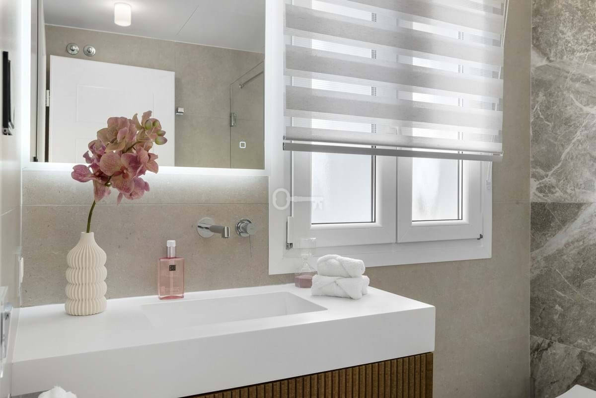 The penthouse includes five beautifully designed bedrooms, including a spectacular master suite on the upper level. With slanted ceilings, a generous walk-in closet, a spa-inspired bathroom, and a private terrace overlooking the sea and La Concha mountain, this is an oasis of complete relaxation. Two additional bedrooms feature en-suite bathrooms, while two share a modern family bathroom. A flexible fifth room serves perfectly as a guest bedroom or office. A separate laundry room with terrace access shows that even the practical details have been given the same attention.