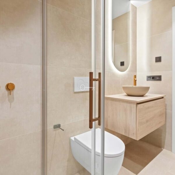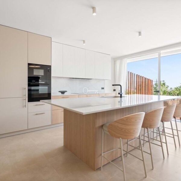 Designed with a contemporary vision, the property combines premium materials, refined aesthetics and functional design to create a modern living environment. The interiors are bright and open, with a spacious living and dining area flowing into a sleek designer kitchen equipped with high-end appliances. Natural tones and clean lines enhance the atmosphere, while large glass doors lead to a south-facing terrace with panoramic views of the Mediterranean and the lush communal gardens below.