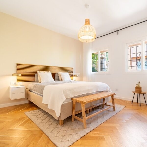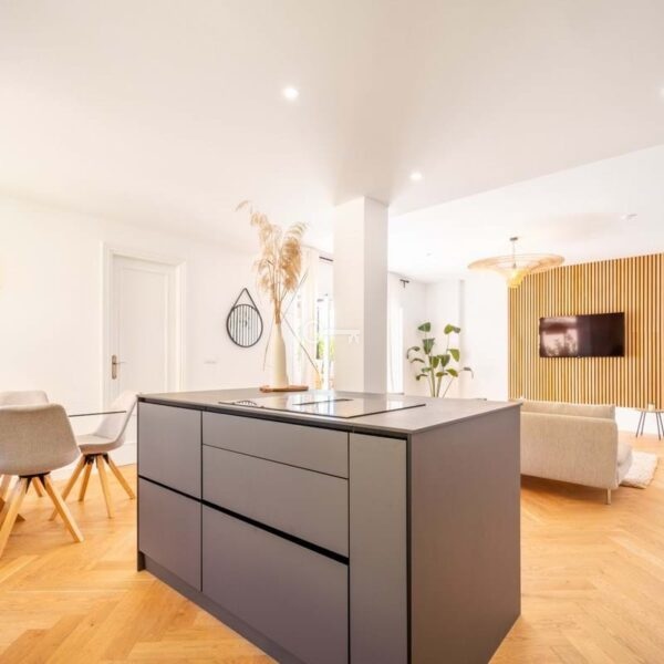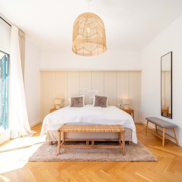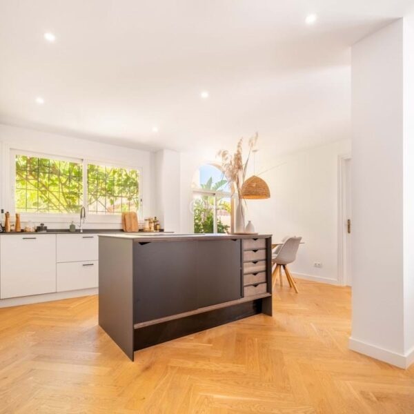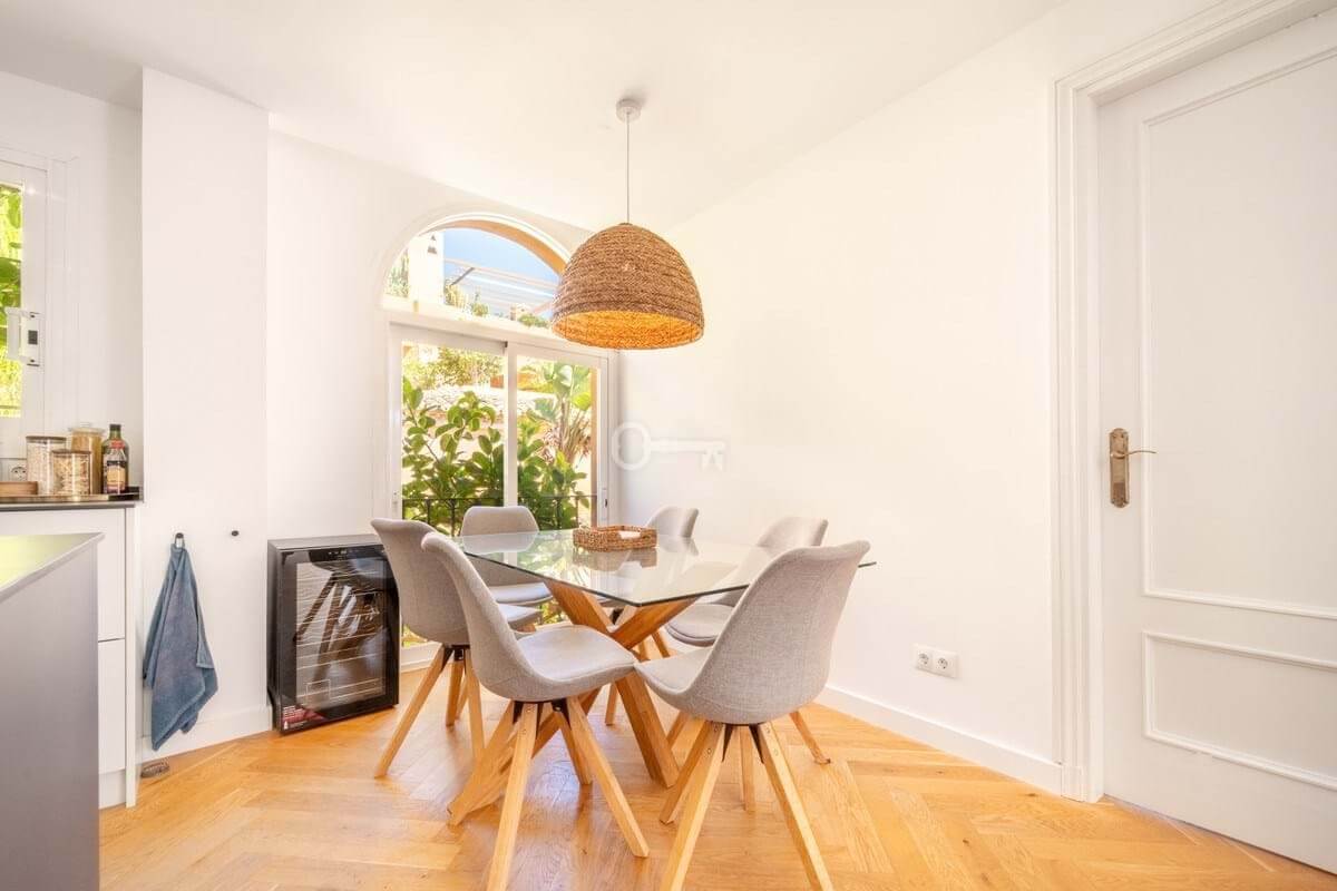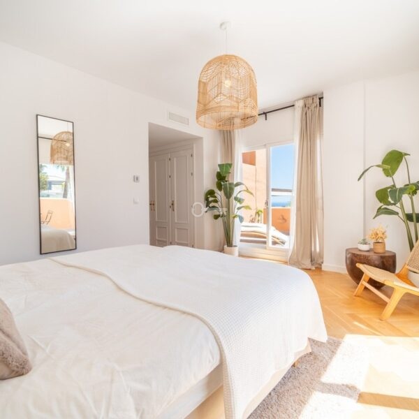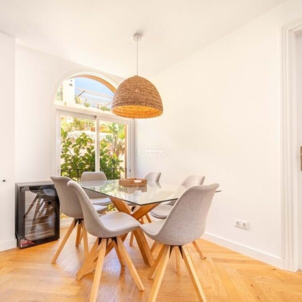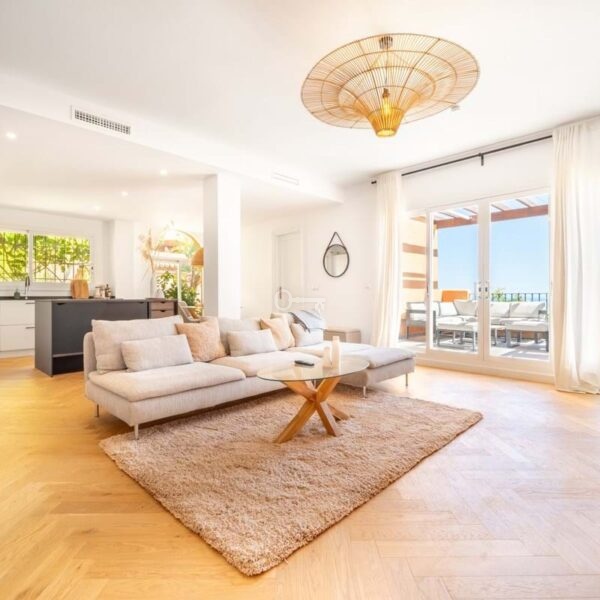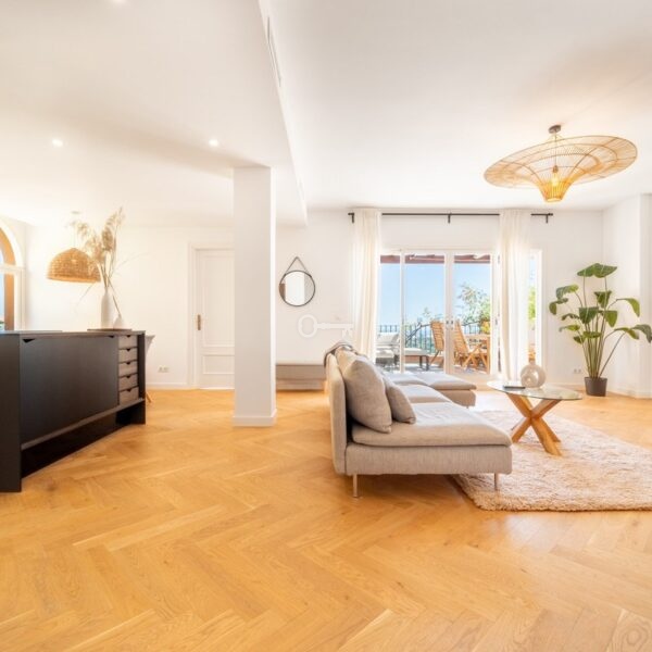 The penthouse features three generously sized bedrooms and two modern bathrooms, all recently renovated to reflect contemporary elegance. The interiors are adorned with wooden floors and glass doors, enhancing the sense of space and light throughout. Fully furnished to the highest standards, the property also offers the option for custom furniture to suit individual preferences. A private terrace and both covered and uncovered outdoor spaces provide ample opportunities to enjoy the Mediterranean climate.