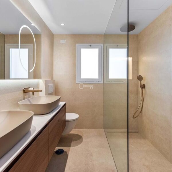 The apartment offers three well-appointed bedrooms, including a serene master suite with a walk-in wardrobe, complemented by modern en-suite bathrooms. A fully equipped kitchen enhances the home, blending practicality with contemporary elegance.