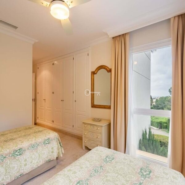 Impeccably maintained and designed for comfort, the apartment features a welcoming entrance hall, a generous living room with direct terrace access, a fully equipped kitchen with adjoining utility room, and three well-appointed bedrooms. The master suite includes a walk-in closet and en-suite bathroom, complemented by a guest bedroom with its own en-suite and a third bedroom with a separate bathroom.
