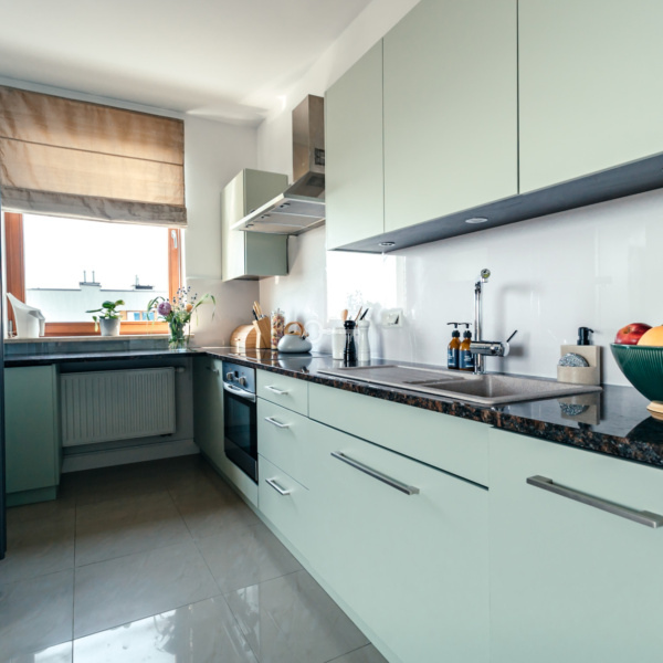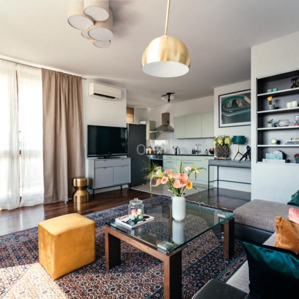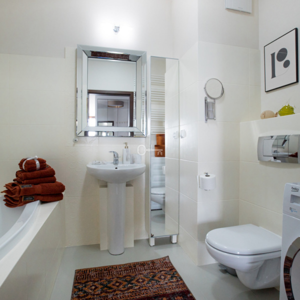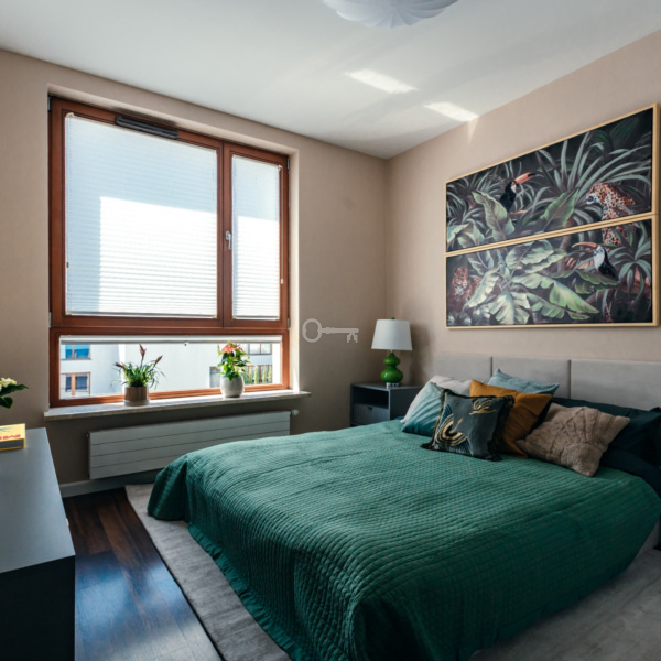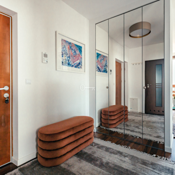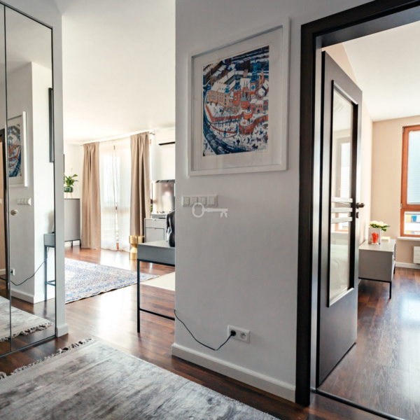The flat is located in a great location on a gated estate, in the southern part of the Mokotow district of Warsaw. It is a perfect place for people who value comfort and convenience of living. It is only a dozen or so minutes away from the very centre of the city with its rich entertainment and cultural offer. Just a few minutes’ walk from Galeria Mokotów, in the neighbourhood there are medical facilities, schools and even language kindergartens.
