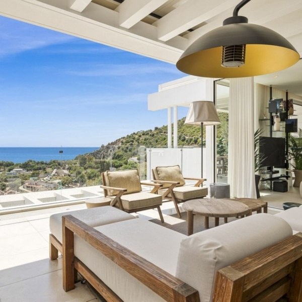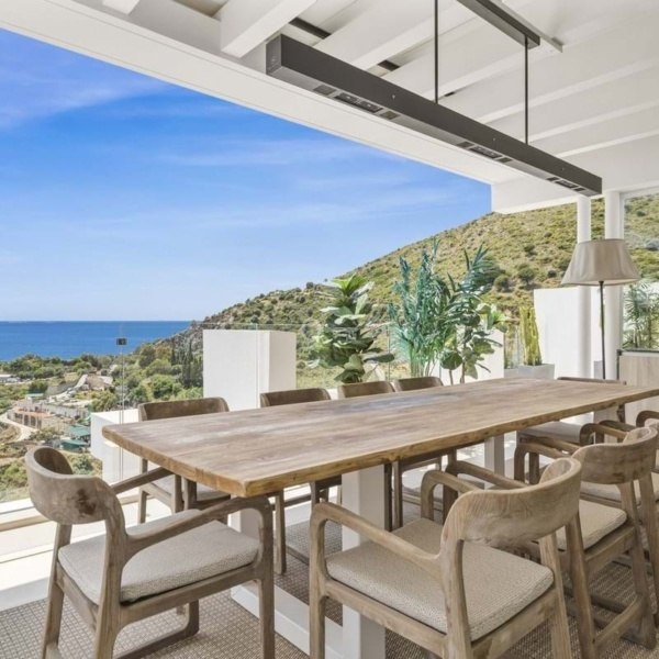 Bathed in natural light, this sophisticated home boasts a spacious sun-drenched terrace with a sought-after southwest orientation, offering uninterrupted views of both the Mediterranean Sea and the Sierra de las Nieves mountains. Floor-to-ceiling sliding glass doors connect the open-plan living area and the master bedroom directly to the terrace, creating a seamless indoor-outdoor flow.