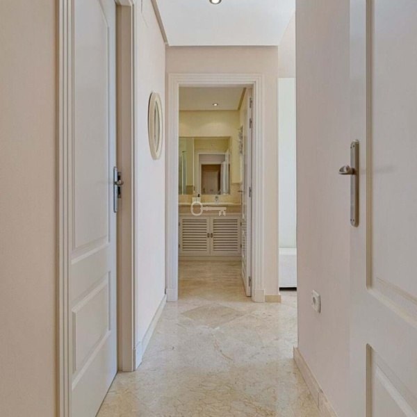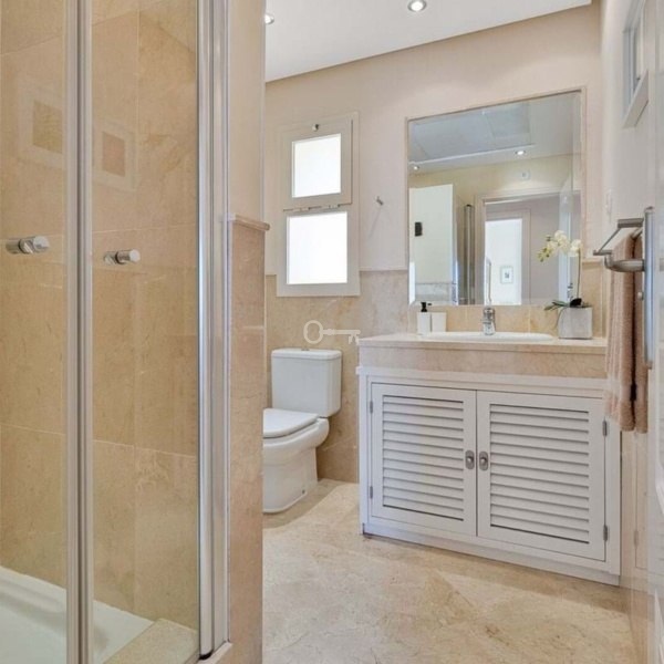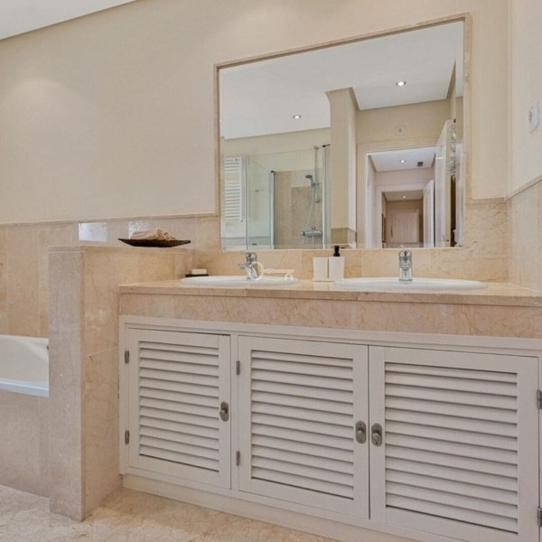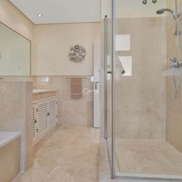 The master bedroom is both spacious and elegant, featuring direct access to the terrace, a large walk-in dressing room, and a luxurious en-suite bathroom with a walk-in shower and a bathtub with an additional shower overhead. The second bedroom is well-sized, with fitted wardrobes, and is served by an adjacent bathroom equipped with a large walk-in shower.