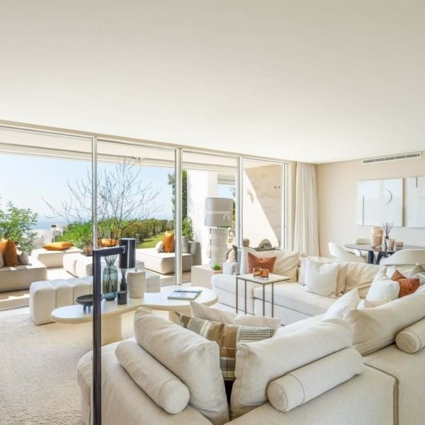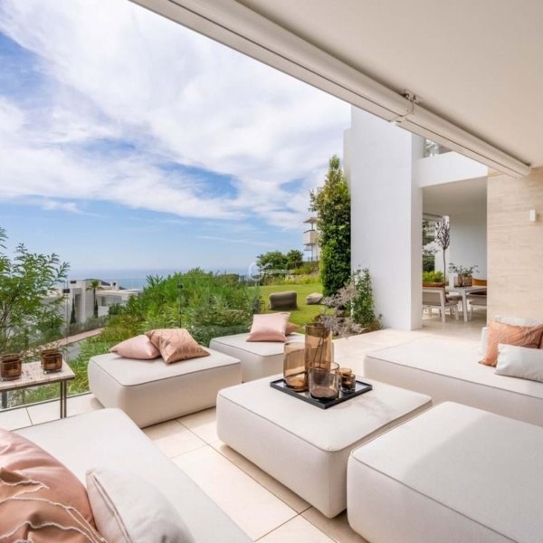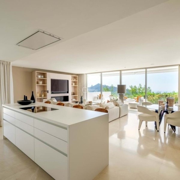 This space opens onto a spacious terrace with a charming chill-out zone, which flows into the garden, where stunning panoramic sea views awaitoffering a serene setting for both relaxation and entertaining. Marble flooring extends throughout the apartment, enhancing the sense of continuity and luxury.
