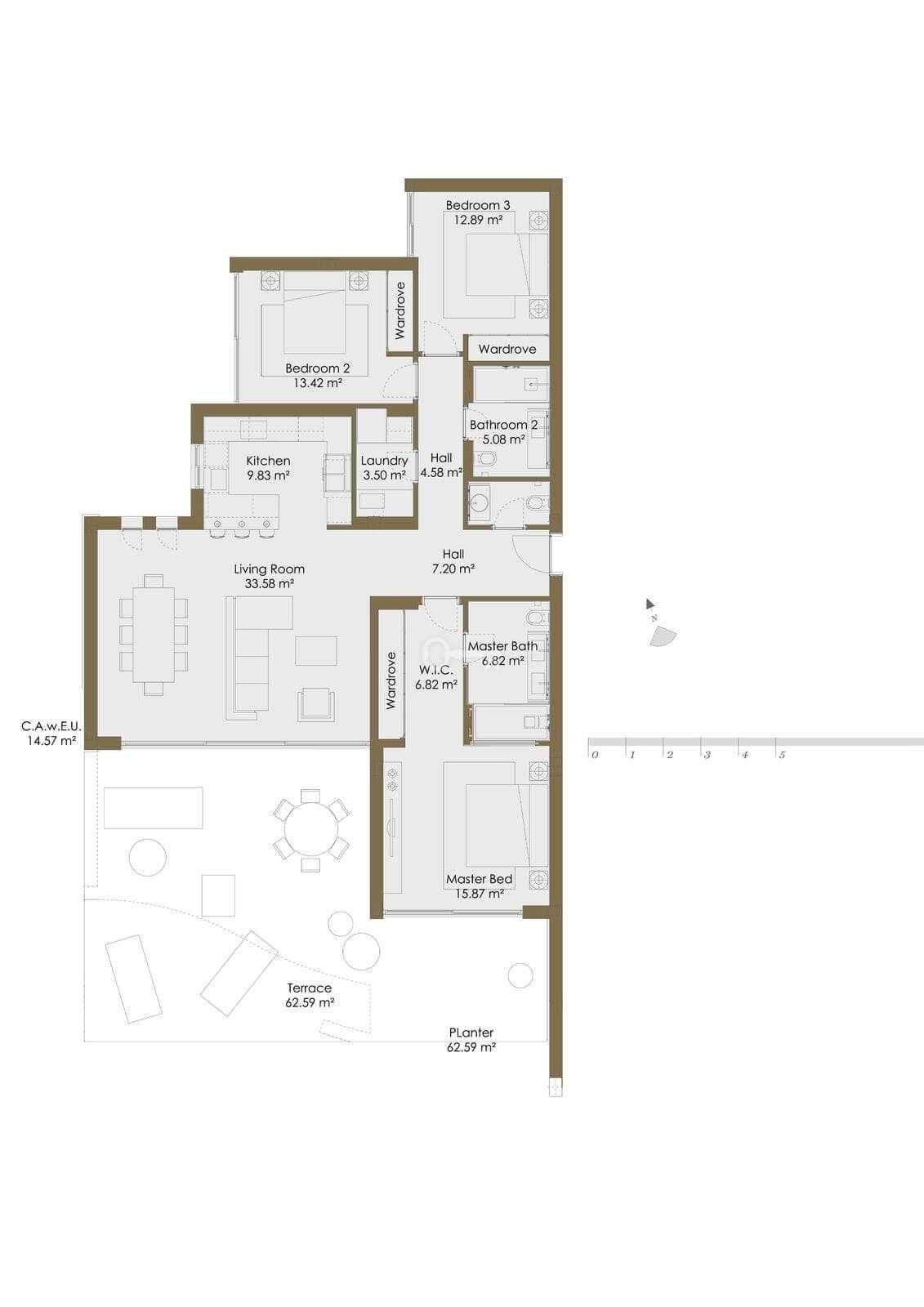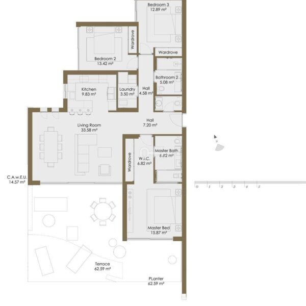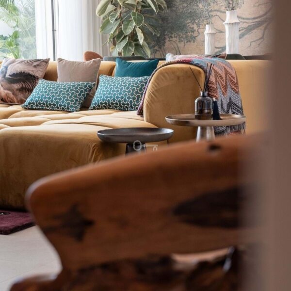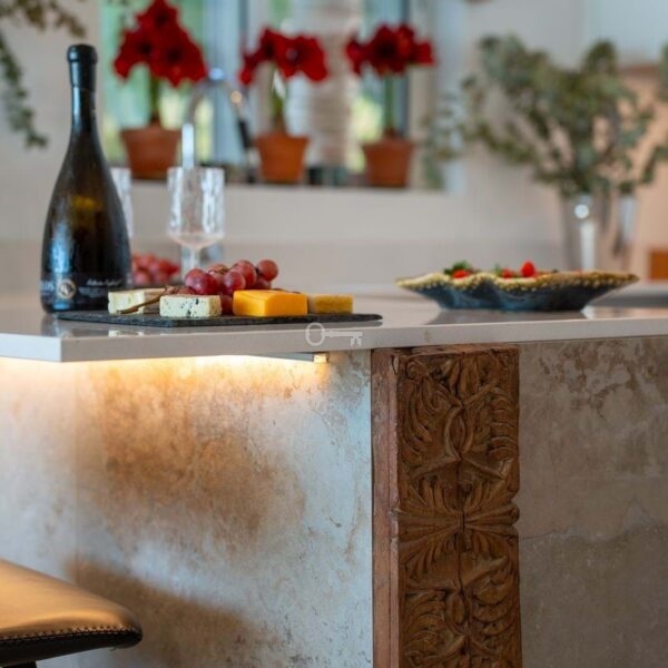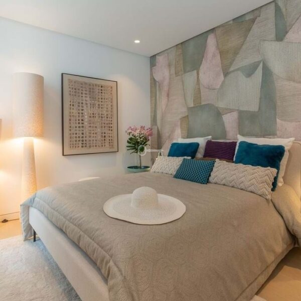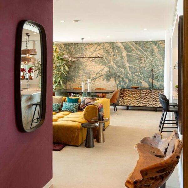 The apartment offers three spacious bedrooms and 2 bathrooms, including a master suite with a walk-in wardrobe and direct access to the terrace, and a guest toilet. Finished in a warm and natural palette, the interiors combine textured walls, oak elements and stone details to create a refined yet welcoming atmosphere.