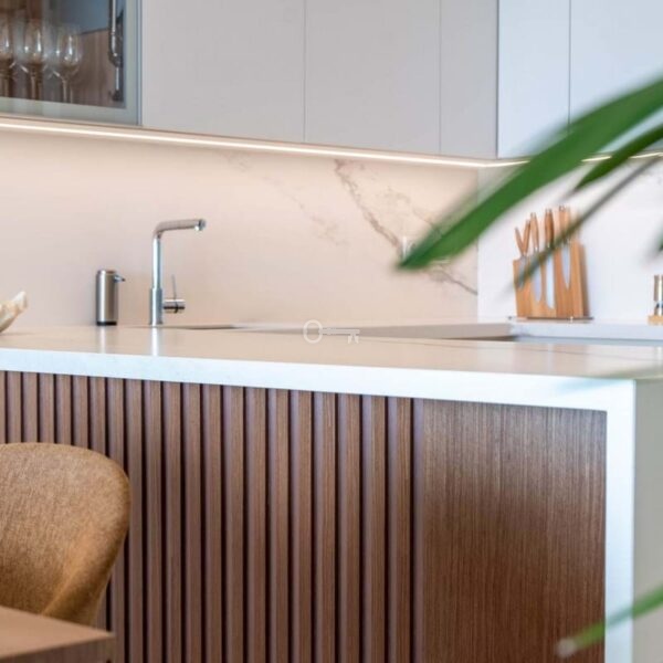 The kitchen is a fully equipped designer installation by Gunni & Trentino, featuring high-quality appliances and contemporary cabinetry conceived for both daily living and entertaining. Clean architectural lines and integrated finishes reinforce the aesthetic consistency of the residence.