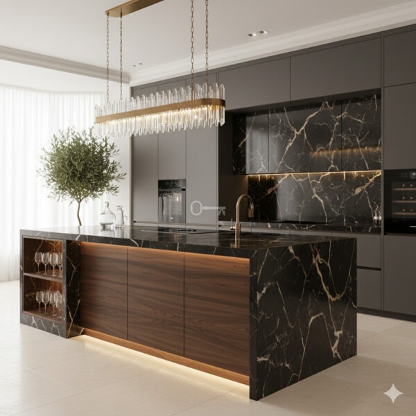 * a kitchen with a large island,
