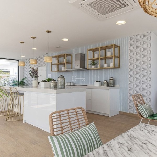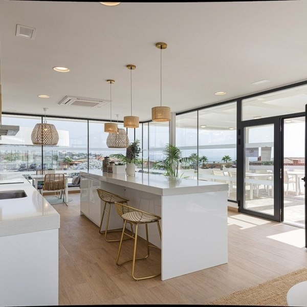 Straight ahead, the open-plan kitchen, dining, and living area is light-filled and modern, seamlessly leading out onto the large terrace, ideal for dining al fresco or enjoying the long, sunny Spanish afternoons while soaking in the stunning sea views.