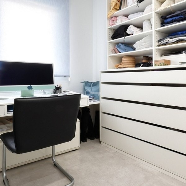 As you enter the property, youre welcomed by a spacious hallway. To the right, youll find the master bedroom featuring an en-suite bathroom and direct access to the expansive terrace, perfect for morning coffee with sea breezes. To the left, two additional bedrooms offer flexibility; one is currently styled as an office/walk-in wardrobe. These rooms share a modern family bathroom.