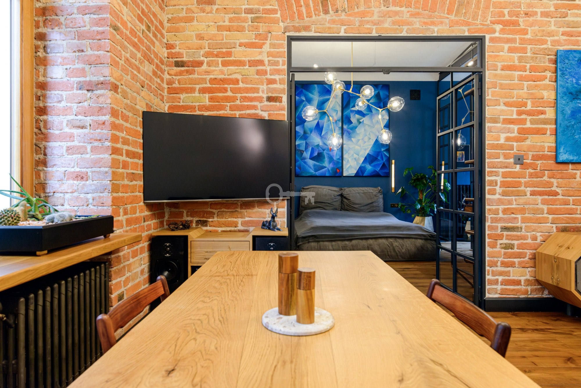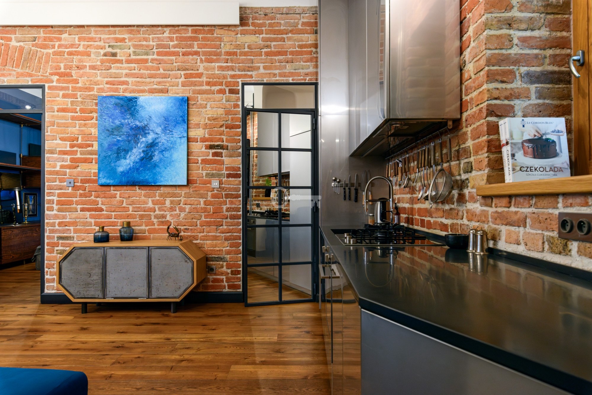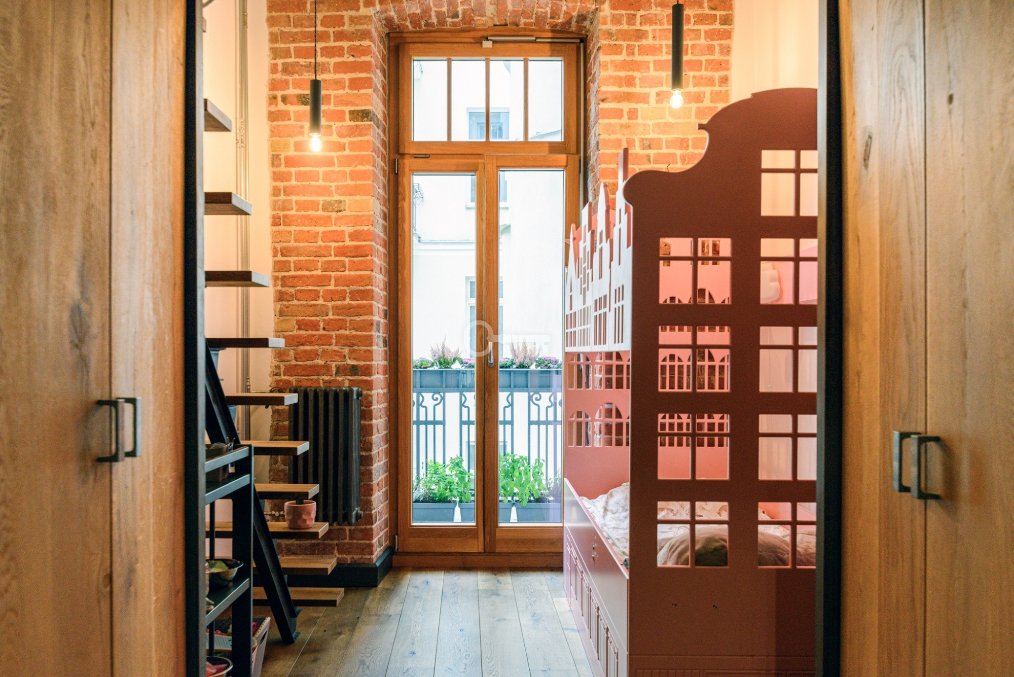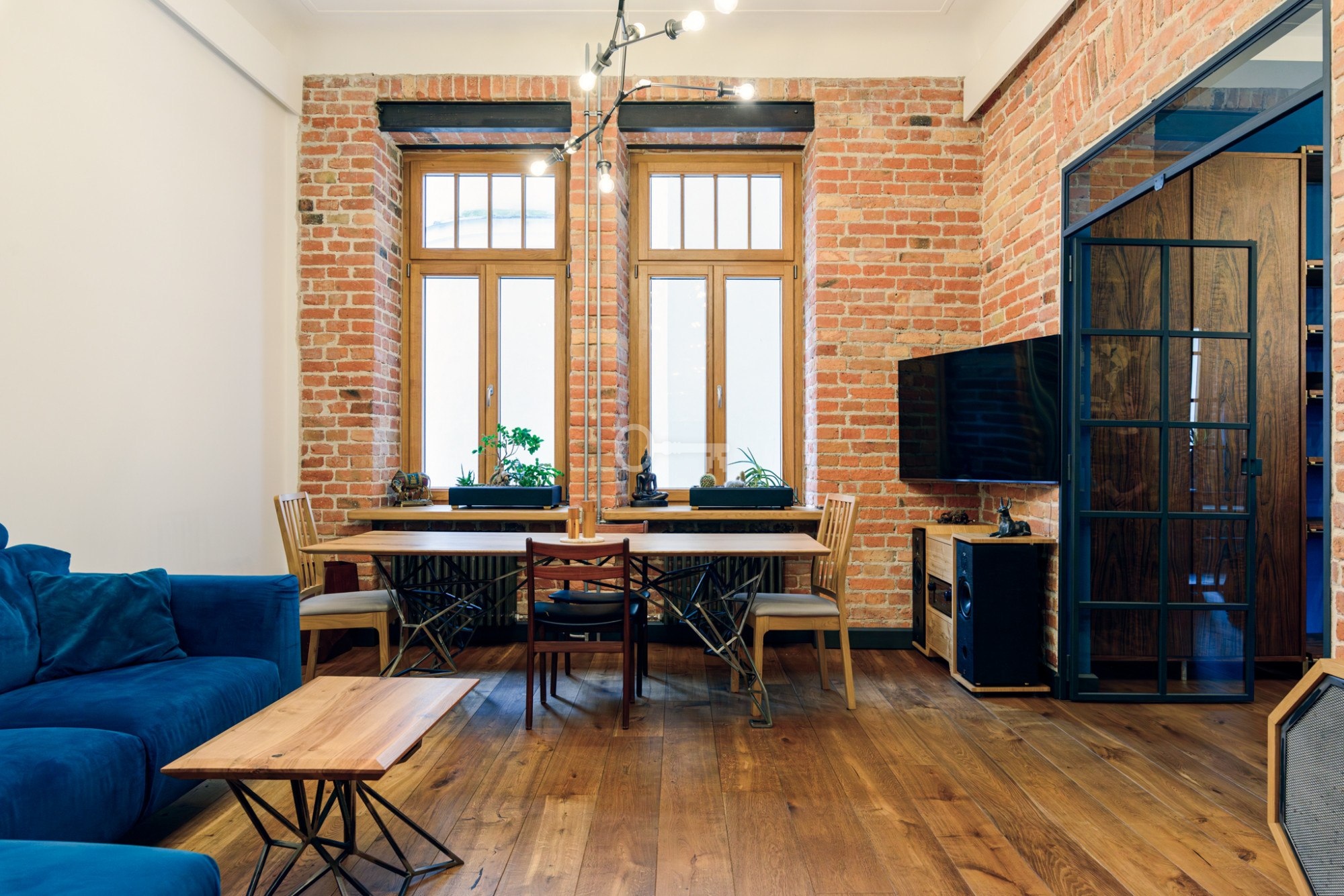Luxurious semi-loft style apartment designed by a renowned Warsaw architectural studio. The atmospheric interiors, are highlighted by the original restored oak flooring, the red of the brick walls, the hardware and the gallery in the glazed hallway. The apartment was finished by the owners with attention to detail – original radiators or designer lighting.