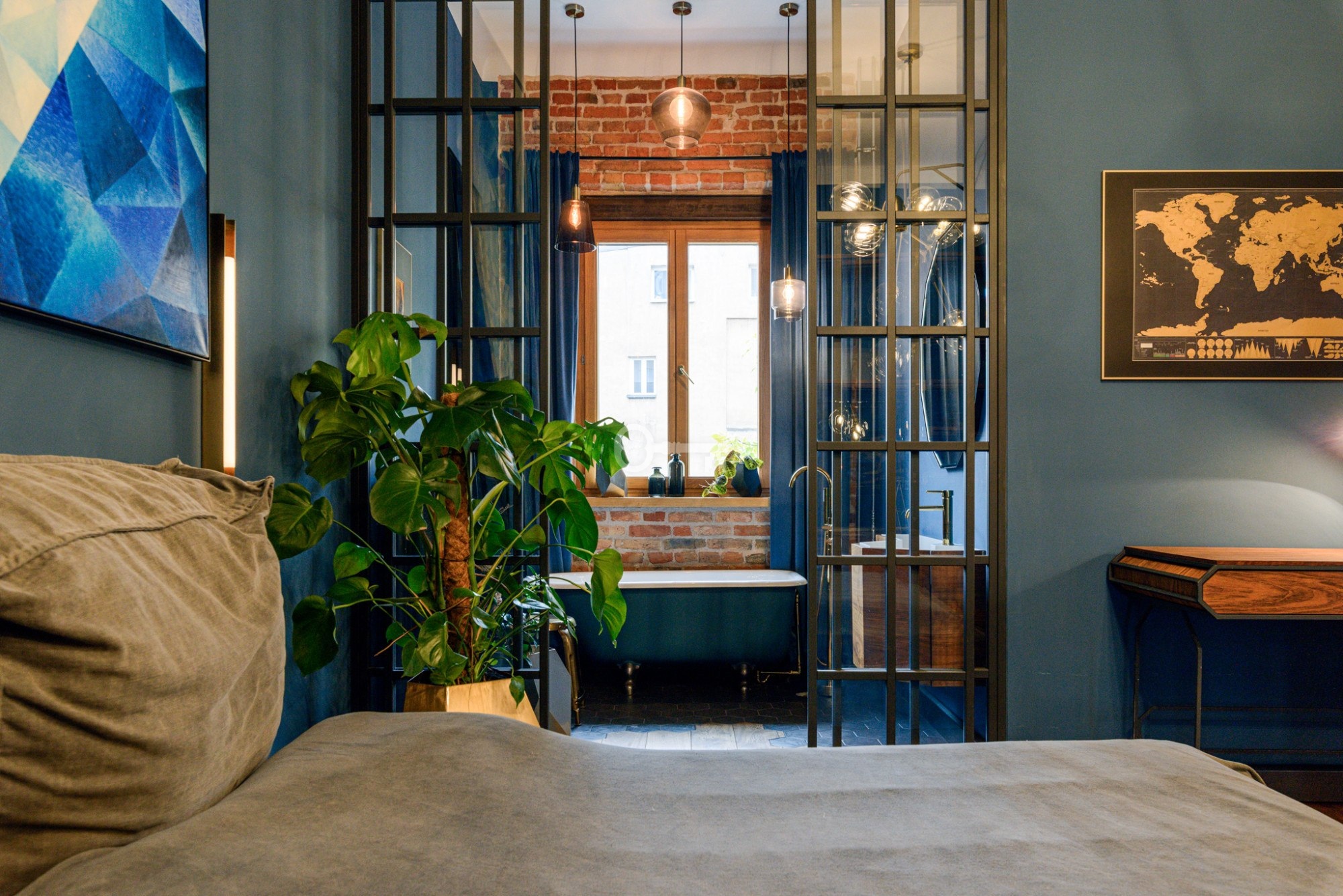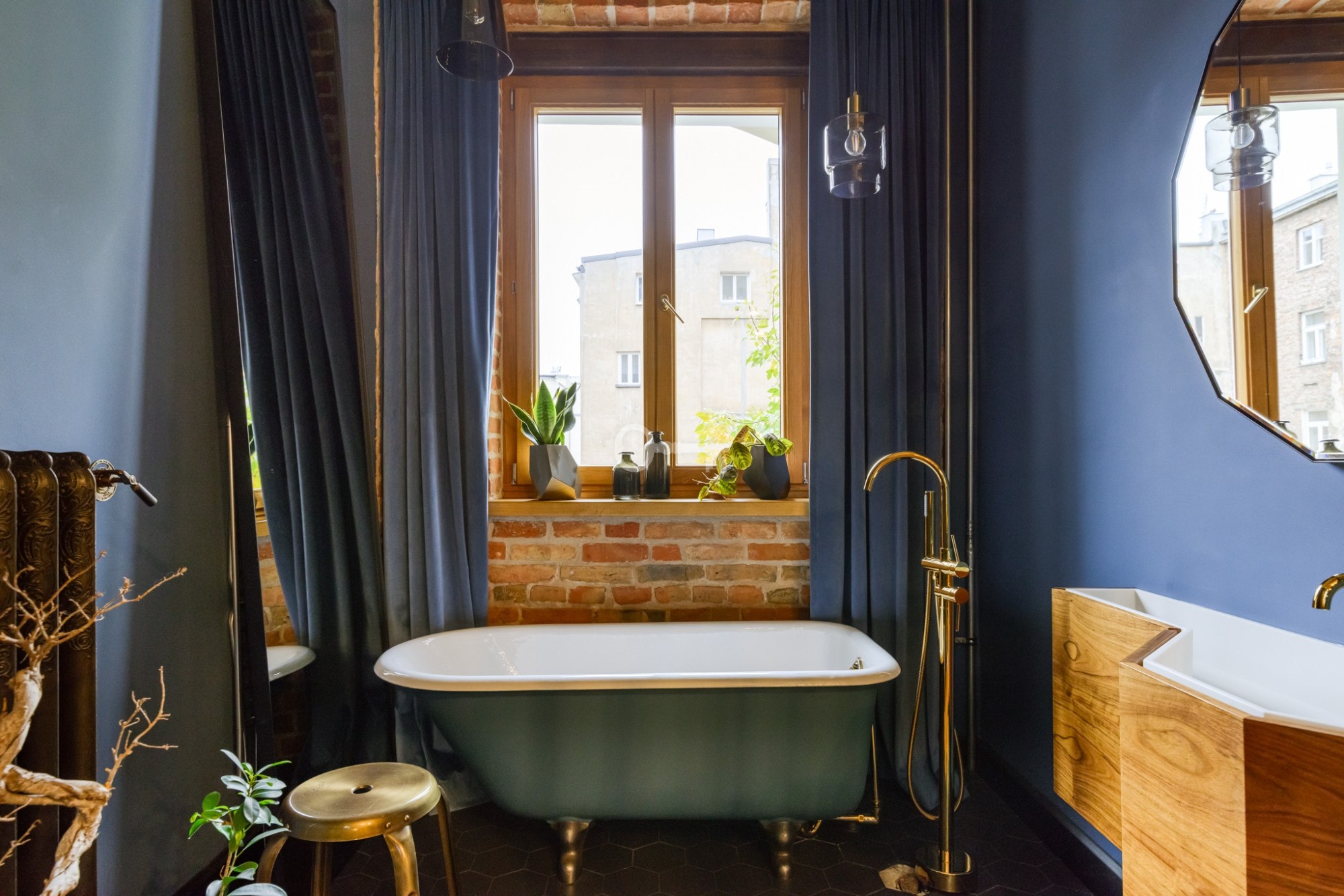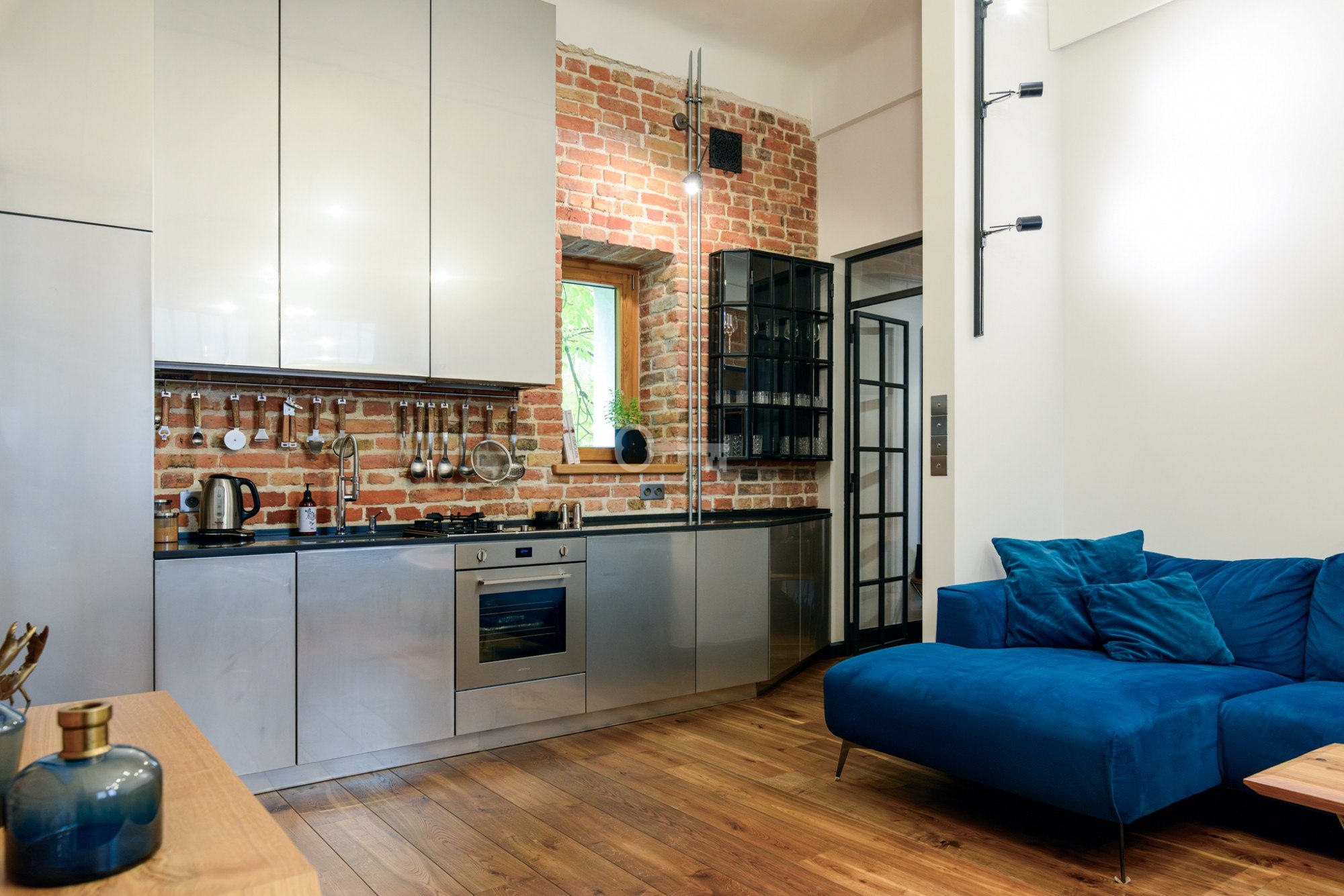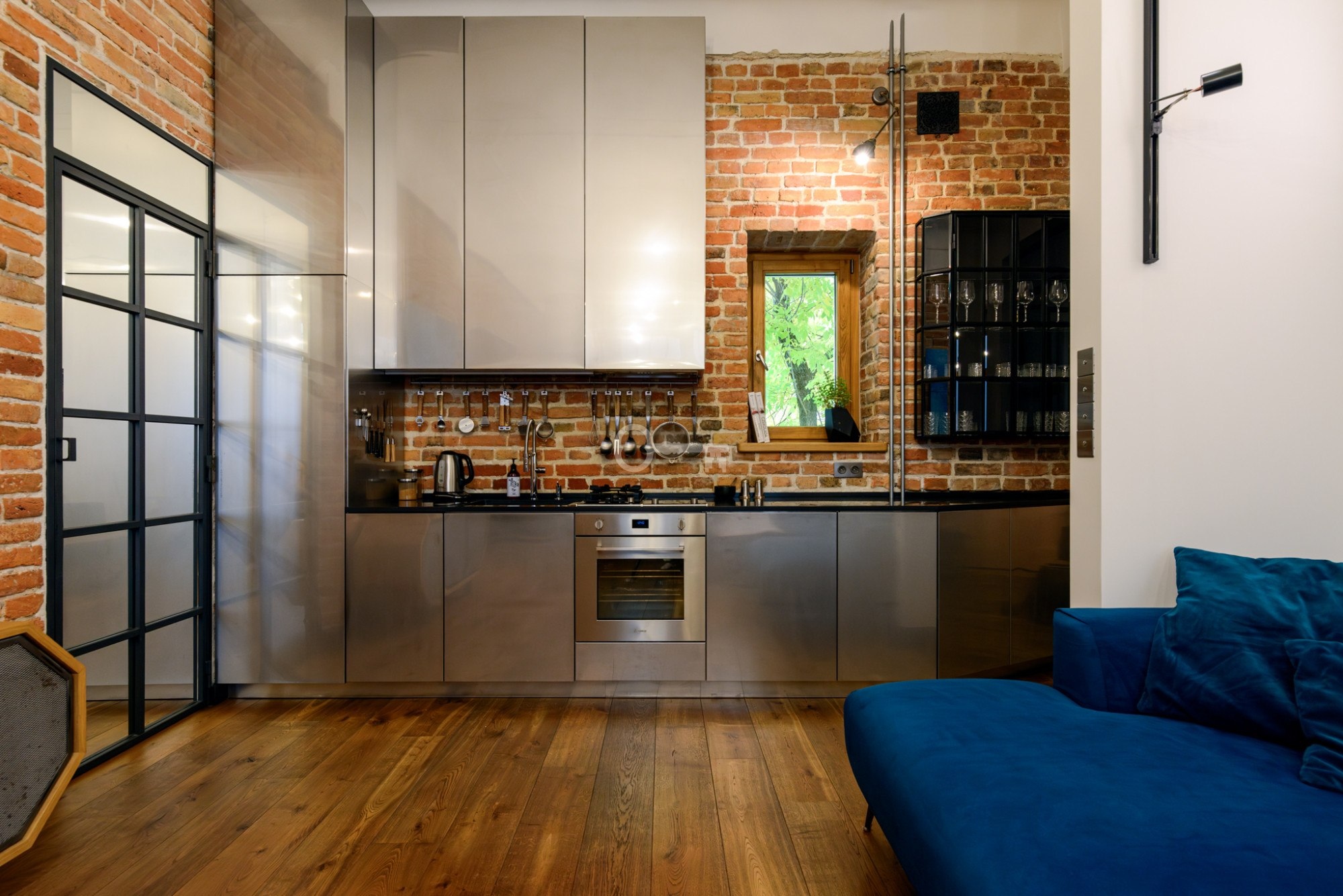 Luxurious semi-loft style apartment designed by a renowned Warsaw architectural studio. The atmospheric interiors, are highlighted by the original restored oak flooring, the red of the brick walls, the hardware and the gallery in the glazed hallway. The apartment was finished by the owners with attention to detail – original radiators or designer lighting.