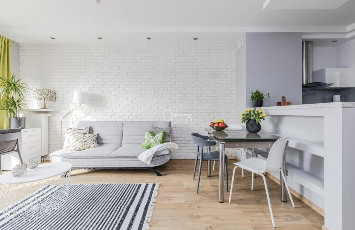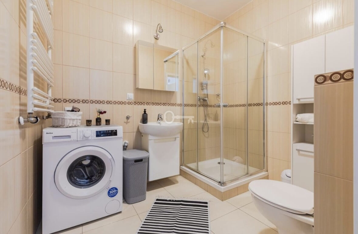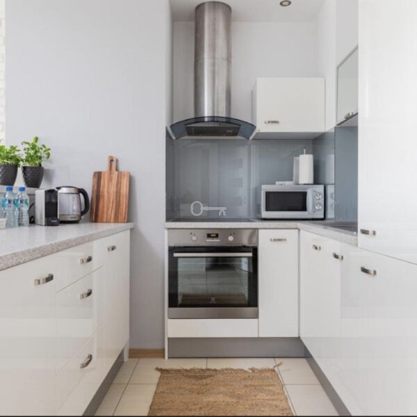 The apartment is fully furnished and ready to move in. The floors are covered with laminate panels, and PVC windows provide good insulation. The apartment is fully equipped.
