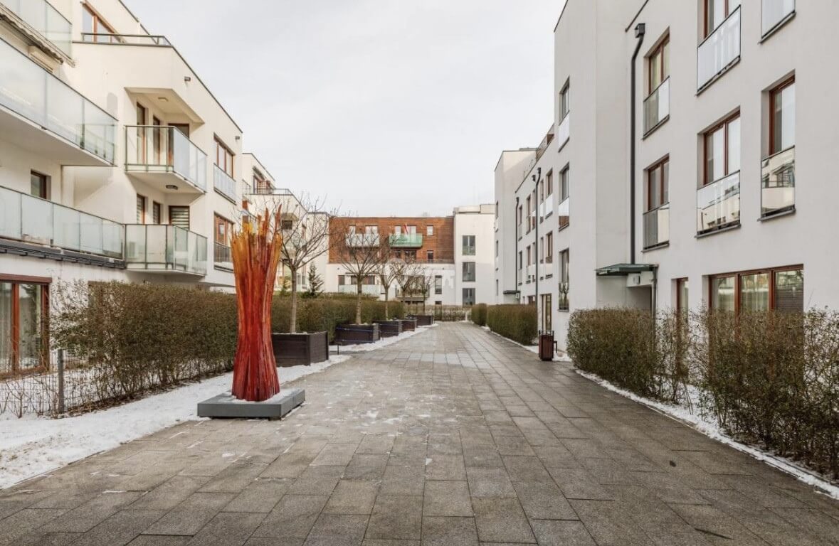 A peaceful and green location in Ursynów, in the quiet enclave of Skarpa Ursynowska. Convenient access to public transport. Nearby there are bicycle paths, shops, and the Warsaw University of Life Sciences.