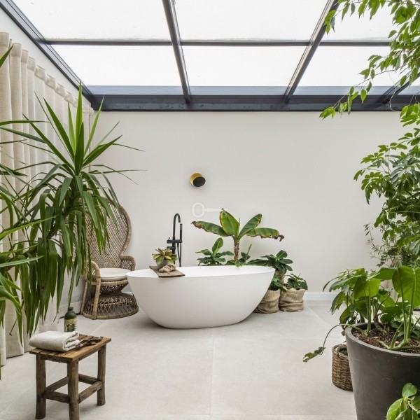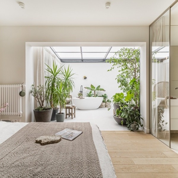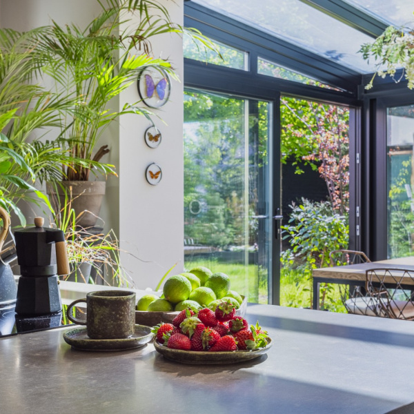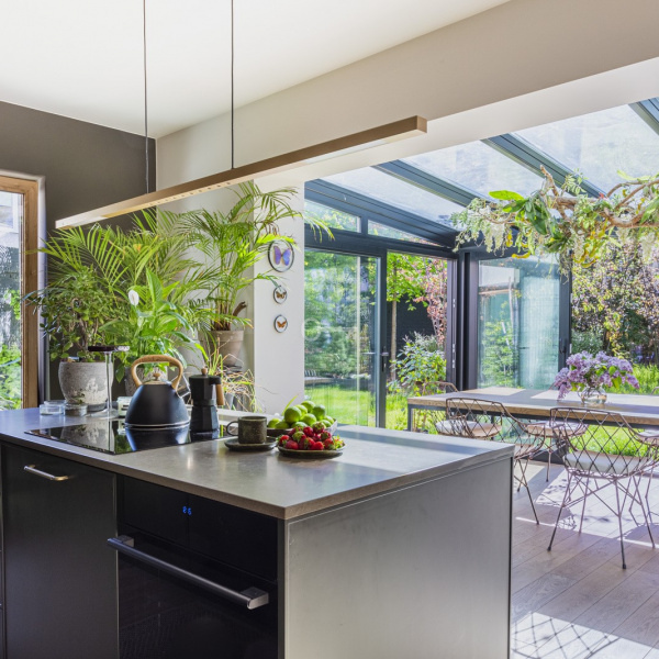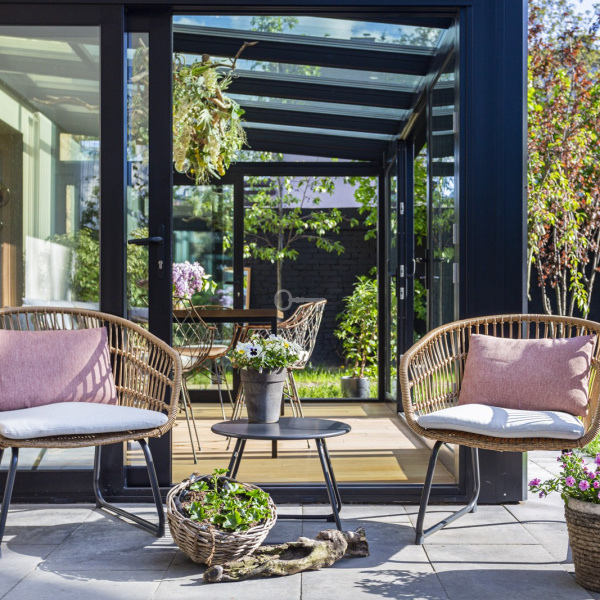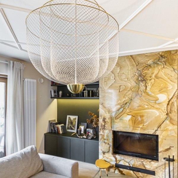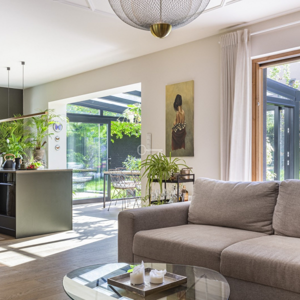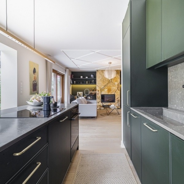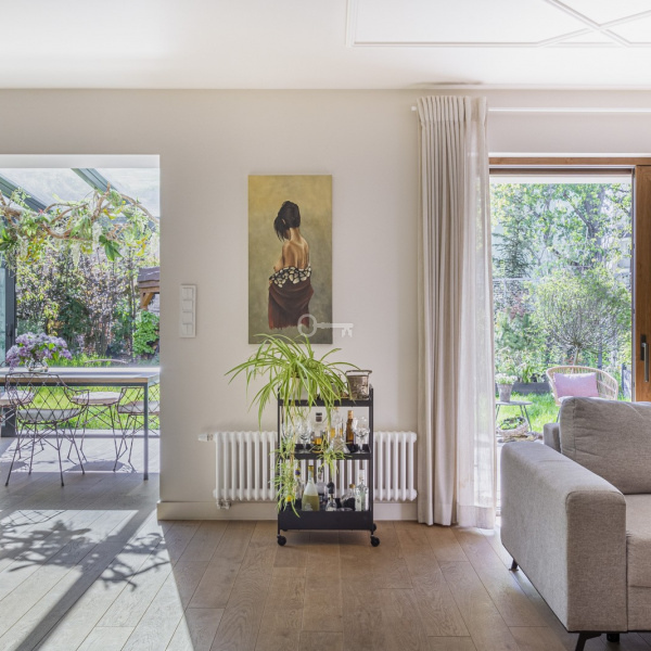 105 m2, with an impressive living area, consisting of a representative living room with a traditional fireplace, open kitchen and dining room. The open kitchen overlooks the garden bathed in greeneryód and the first conservatory with a large table for 10 peopleób . Thanks to the possibility of extending the glazed side walls of the orangery, in summer it can also serve as a covered veranda. In the hallway, a toilet and tastefully hidden closets behind high-quality vinyl wallpaper.