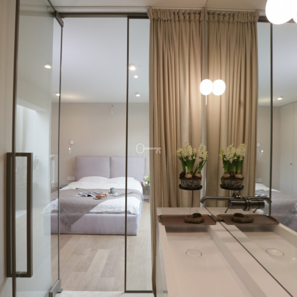 In the private part of the apartment there is a spacious bedroom with a master bathroom illuminated by a large window and an additional space currently serving as a painting studio for the lady of the house. The space can be easilyób adapted into a large office or a luxurious dressing room. The apartment was designed by a well-known and respected architectural studio MoodWorks.