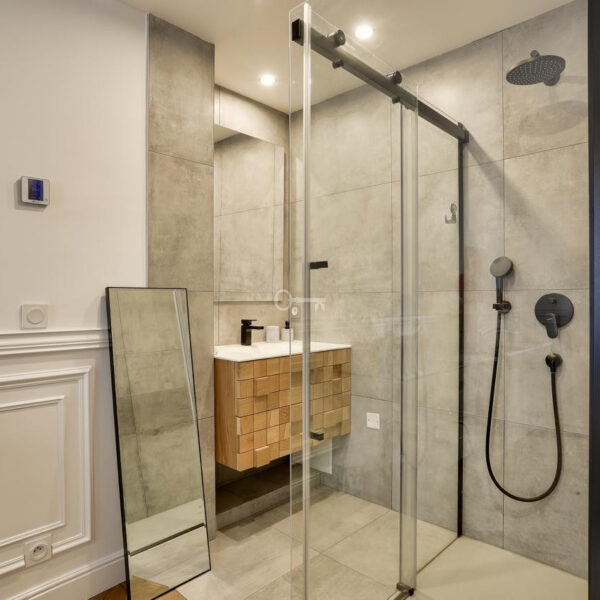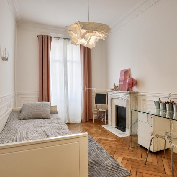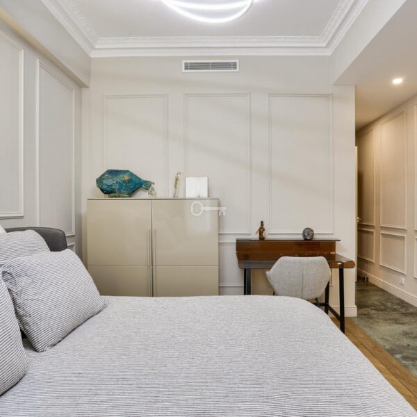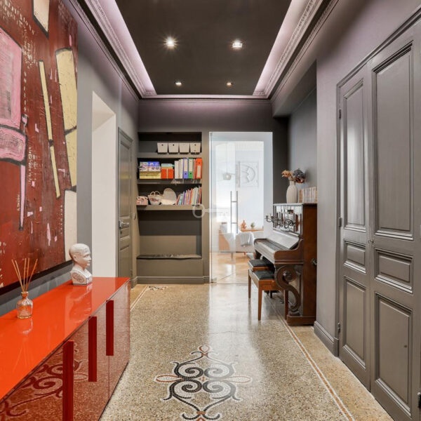 With a total living area of 116 sqm, the apartment impresses with its spaciousness and elegance, enhanced by impressive 3.10 m high ceilings. The bright 45 sqm living area, benefiting from a south-facing exposure and direct access to the balcony, offers a comfortable and refined living space.