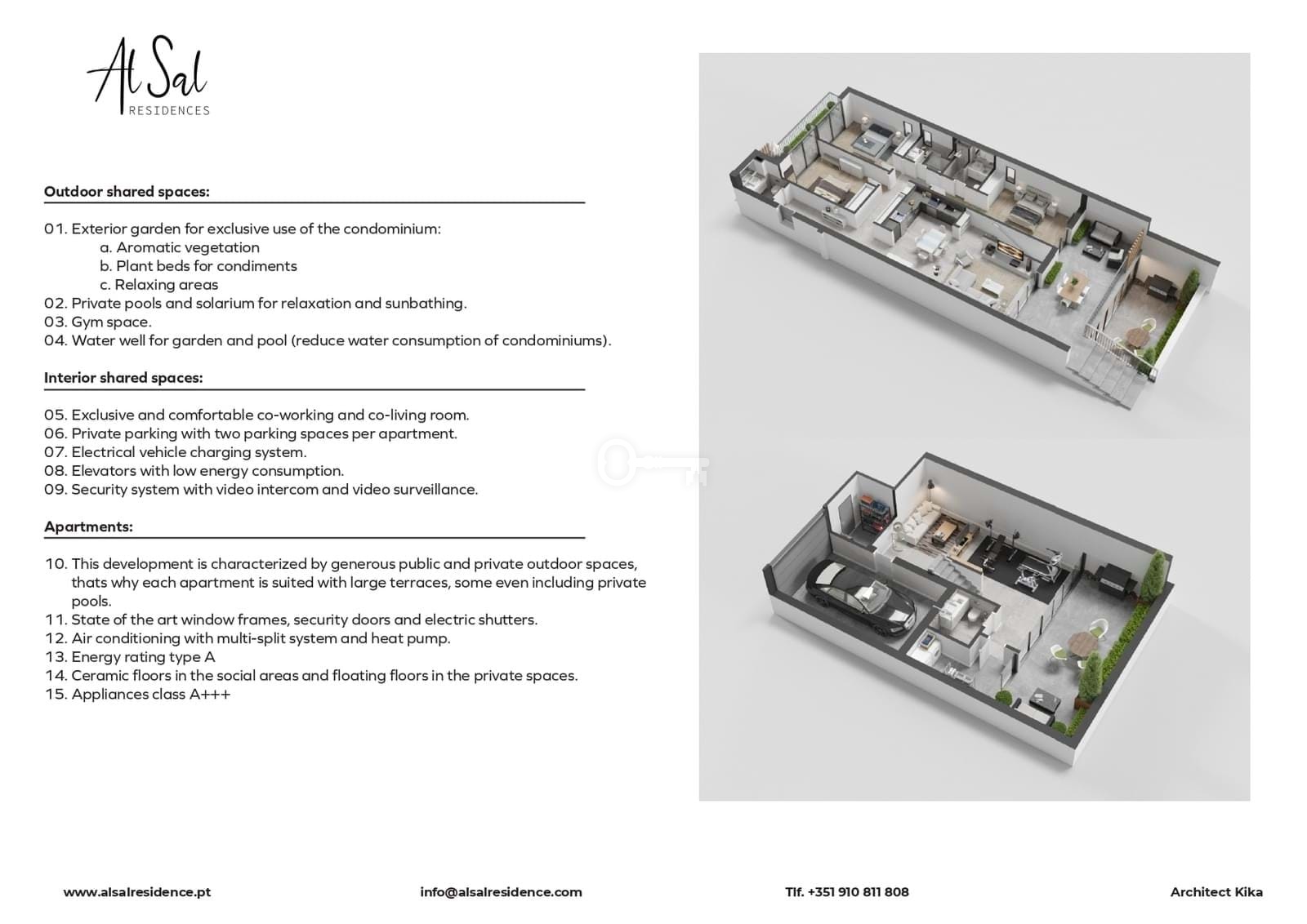 Al Sal Residences is an exclusive private condominium in Alcochete, designed for those seeking a modern, elegant, and sustainable lifestyle without giving up proximity to Lisbon. With only 28 apartments, it stands out for its contemporary L-shaped architecture, designed to favor natural light and enhance common spaces: a pool with a solarium, a central garden, a gym, and co-working and co-living areas.