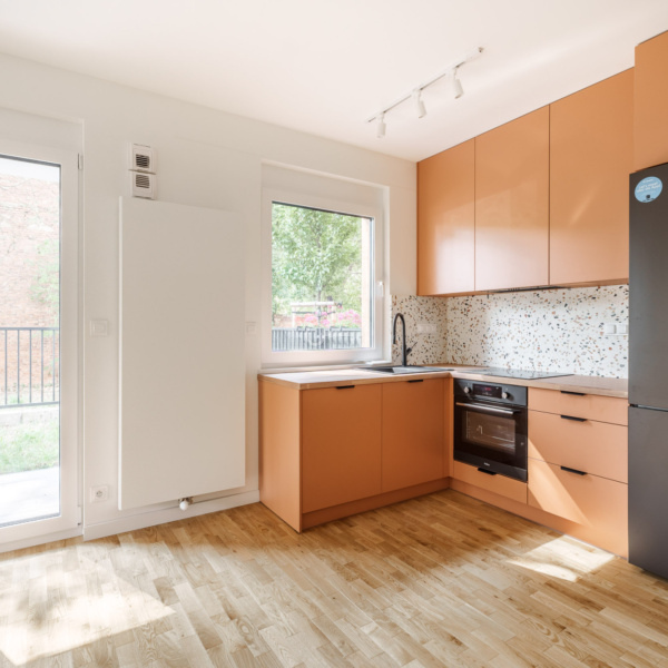 The apartment is located on the first floor. The daily part is a living room with a kitchenette – combined with an exit to the garden. Thanks to the spacious windows, the apartment is very bright and illuminated.
