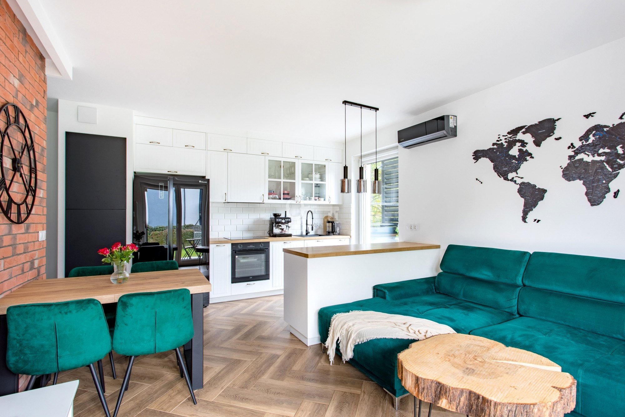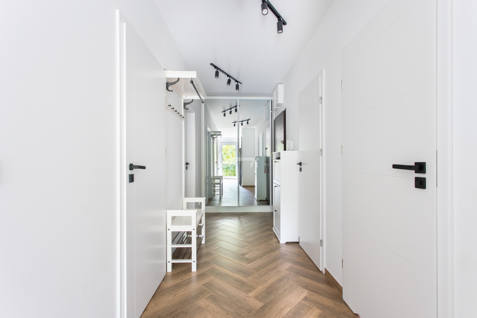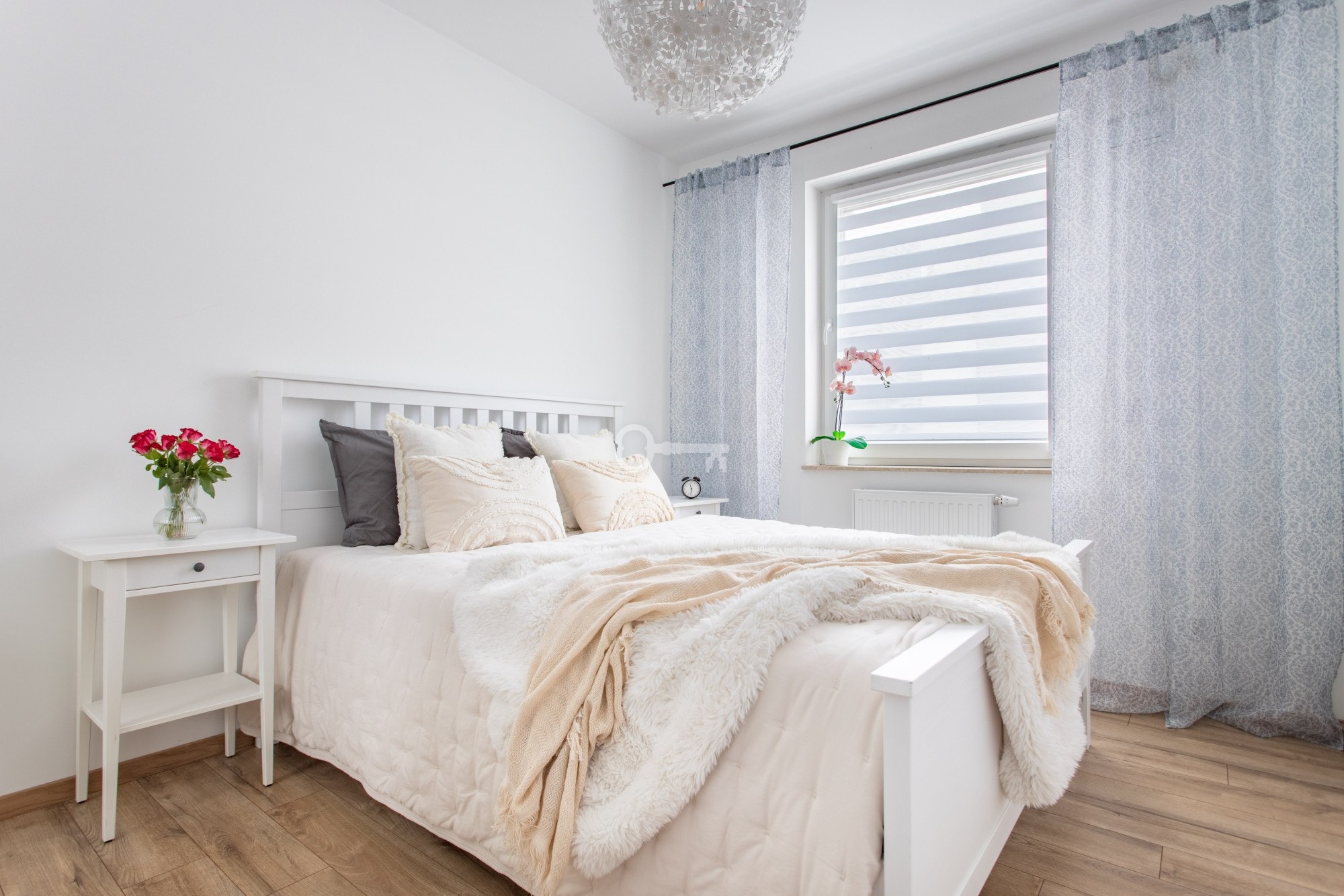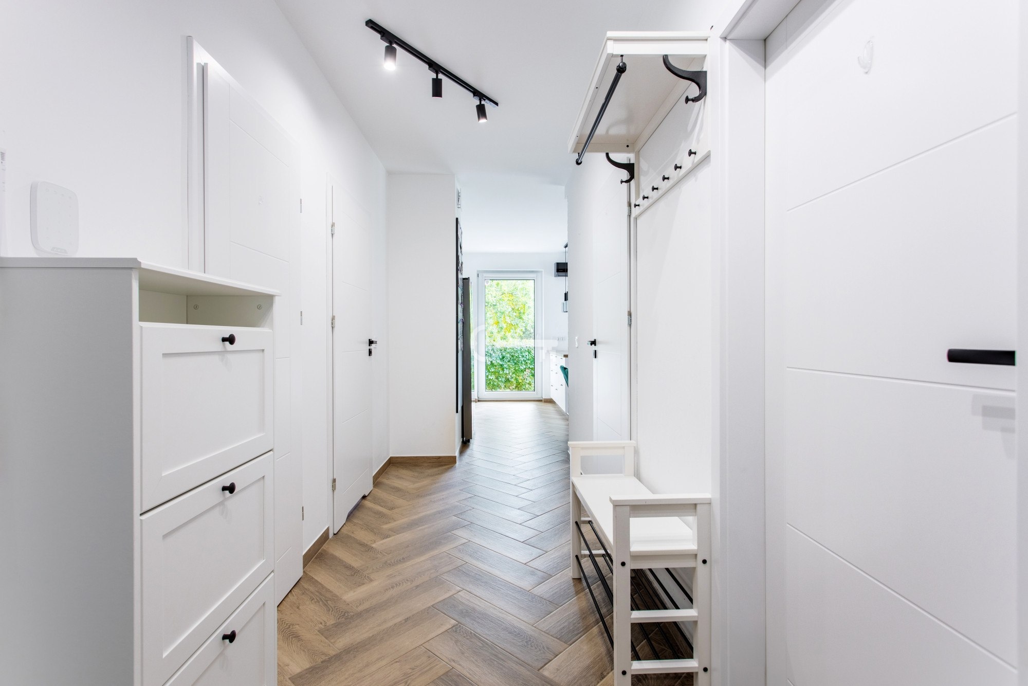 Apartment in a new block in a housing estate built by RT2 Deweloper. The apartment has been finished with attention to detail and is ready to move in. Fully equipped kitchen. Air conditioning unit installed in the living room. Day/night internal blinds and external blinds ensure comfort and privacy. Outside, there is a water connection for watering the garden. The price of the apartment includes a garden design.