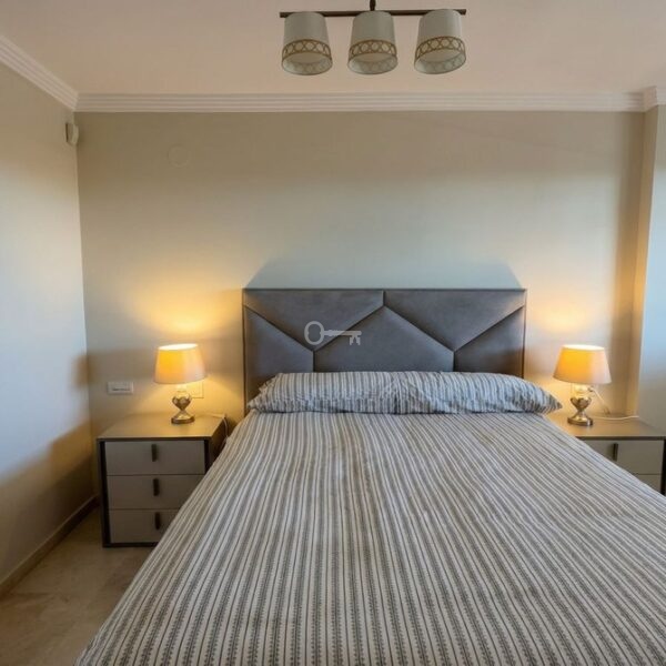 The apartment features two bedrooms and two full bathrooms, including a master en-suite that ensures privacy and comfort. The spacious and inviting living room opens directly onto the terrace, creating a seamless flow between indoor and outdoor spaces.