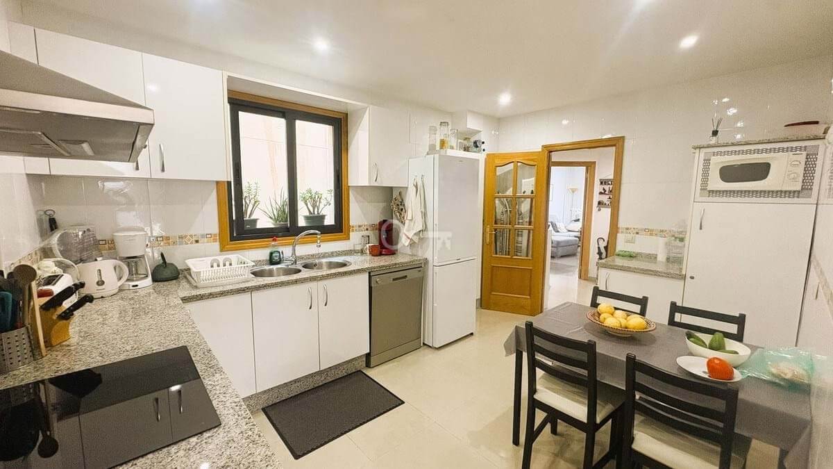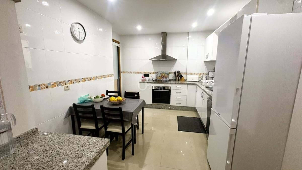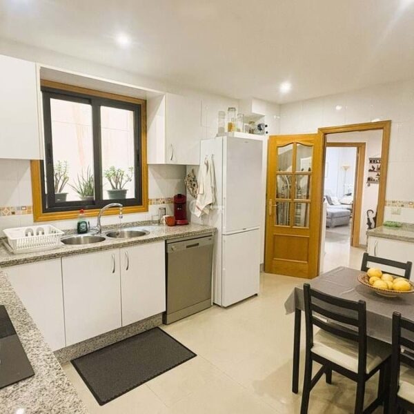 The apartment is situated on the third floor of a secure building with video entry system and lift access. Upon entering, a spacious and welcoming reception hall provides access to all principal rooms. The living room is generously proportioned, comfortably accommodating both lounge and dining areas. This bright and airy space opens onto the main terrace through large patio doors.